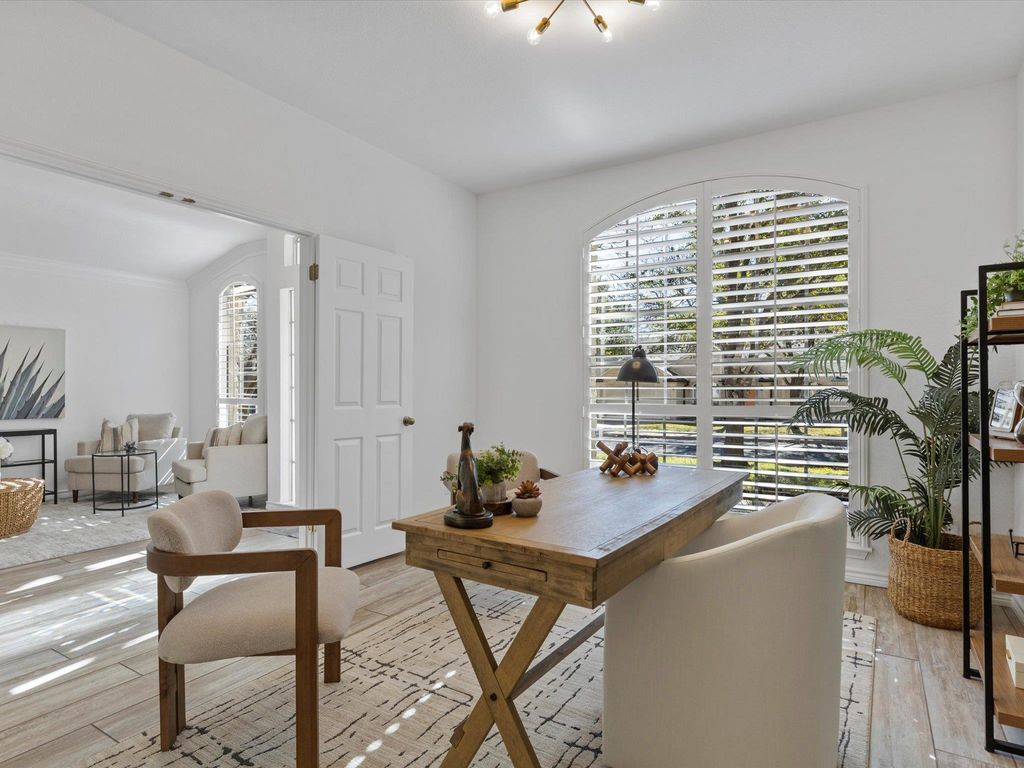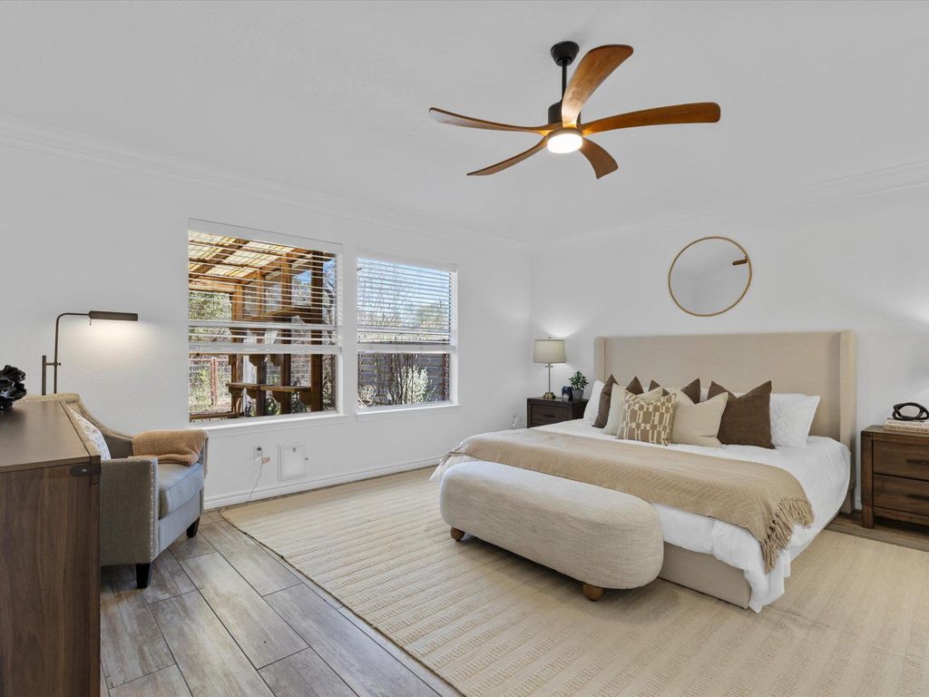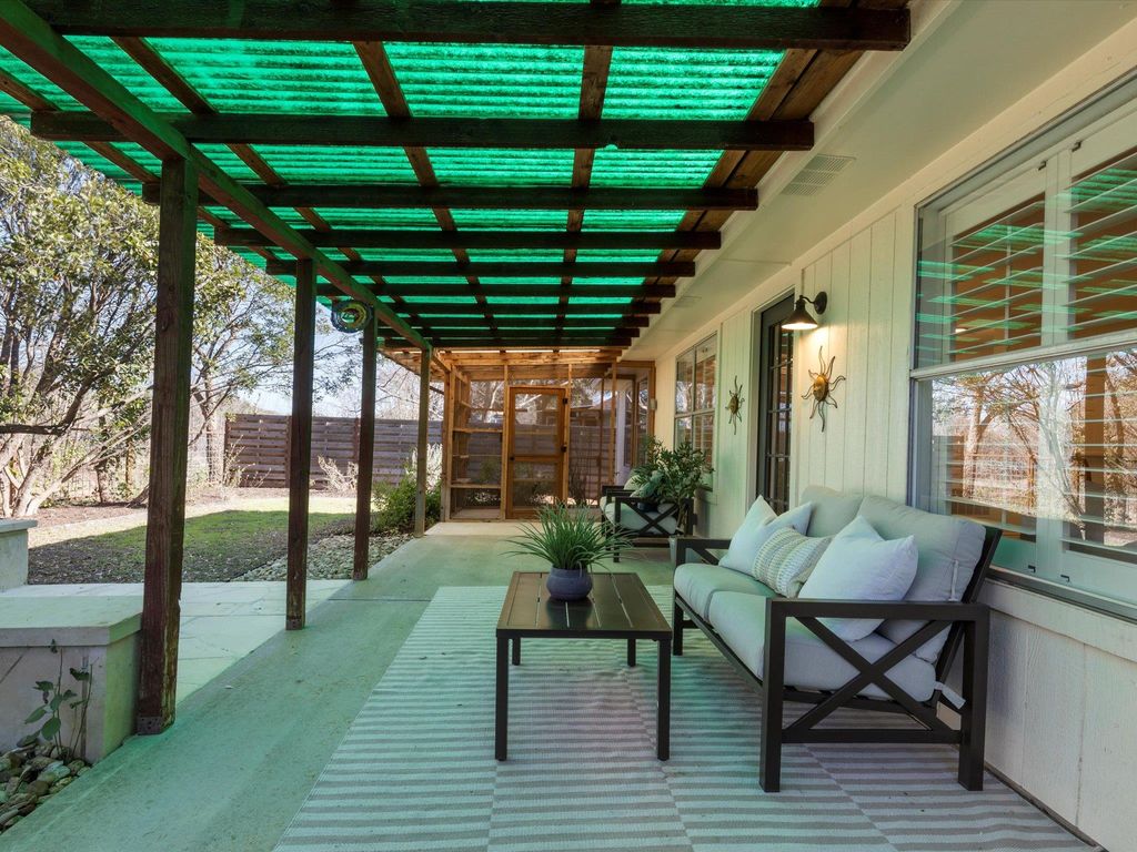 Set along a peaceful greenbelt in South Austin's sought-after Cherry Creek community, this well-maintained single-story home offers a thoughtful layout and a true sense of calm. With four bedrooms, two full baths, multiple living and dining areas, and a private primary suite, the home is both functional and inviting. This one checks all the boxes - wood-look tile flooring, plantation shutters, tall ceilings, neutral paint, recessed lighting, and clean, modern finishes. The kitchen sits at the center of the home, overlooking the main living area, with stainless steel appliances, bar seating along the peninsula, and painted cabinetry that feels timeless rather than trendy. Zoned to highly regarded AISD schools: Cowan Elementary, Covington Middle, and Bowie High. Mature landscaping, shade trees, stone masonry, and a two-car garage create a welcoming first impression. Inside, a light-filled formal living and dining space offers flexibility, while a double-door room off the entry functions easily as an office or 4th bedroom. Large windows in the living and breakfast areas frame serene greenbelt views, and a gas log fireplace adds warmth to the main gathering space. The secluded primary suite includes a private bath and oversized walk-in closet. Outdoor living extends outside onto the covered back porch, ideal for relaxing or entertaining. The backyard is bordered by mature greenery, with a balanced mix of lawn space, plus an alfresco patio extension and a screened "catio" off the porch. Located on a quiet street with no through traffic, this home feels tucked away yet remains close to it all - just minutes from HEB, Arbor Trails, Costco, dining options, and daily conveniences. Neighborhood parks, playgrounds, and greenbelt trails are within walking distance. Google Fiber is available. Easy access to Mopac and ~20 mins to Downtown Austin. This one has it all - come see for yourself today!