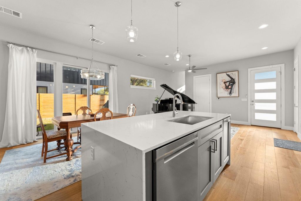 Thoughtfully designed three-story living in the heart of Crestview. This 4-bedroom, 2 full and 2 half-bath home offers an efficient footprint with room to spread out: an open-concept first floor with kitchen, dining, living, and powder bath; three bedrooms (including the spacious primary suite) and two full baths on the second level; plus a third-floor retreat with second living area, fourth bedroom, and half bath. High ceilings, quartz countertops, stainless steel appliances, and a modern white/gray/blue palette create an airy, luxurious feel. Natural light pours in, and dimmers in nearly every room let you set the mood. Storage is exceptional: a large pantry, great cabinet space for serious cooks, an oversized linen/equipment closet on the second floor, and three climate-controlled storage closets on the third floor. The flexible layout works beautifully for many lifestyles"”guests or roommates can enjoy privacy on the upper floors while everyone comes together on the open first floor. The third-floor loft is perfect as a second living room, game room, office, or "away space." Contemporary fixtures, energy-efficient systems, tankless water heater, white oak floors, custom window shades, and a pet-friendly backyard with upgraded limestone and raised fencing round out the home. Two parking spaces (garage + driveway) plus easy street parking add everyday convenience. You're a stroll away from the Crescent Shopping Center and favorites like Stiles Switch BBQ. With super-easy access to UT, Downtown, and The Domain, this location checks every box. This is more than a home"”it's a lifestyle.