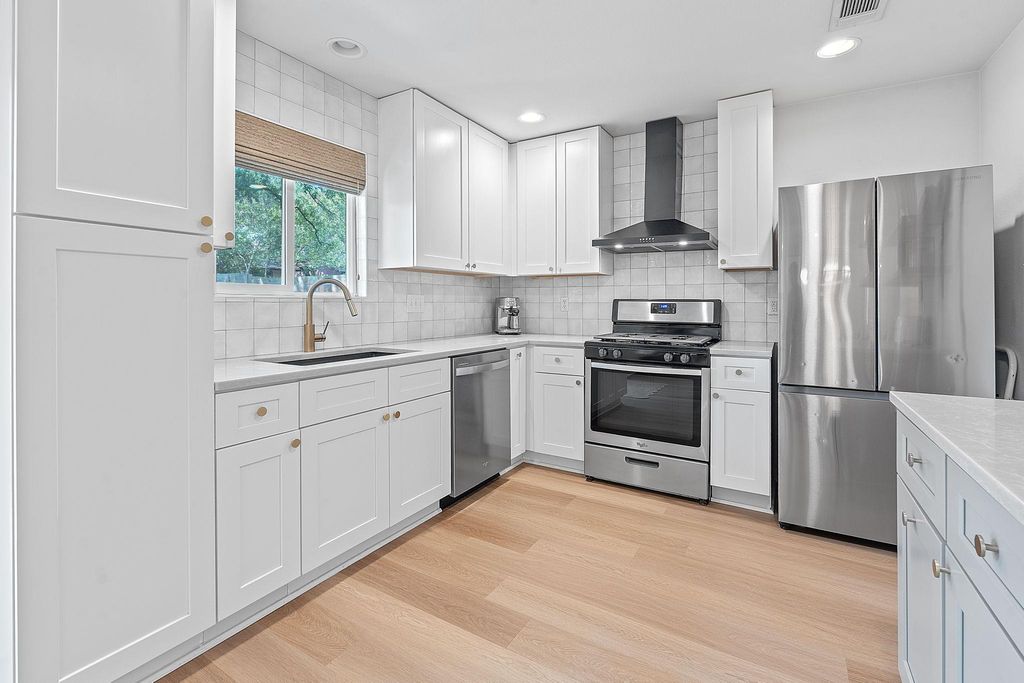 This thoughtfully renovated home is located in the desirable Cherry Creek neighborhood and offers both style and functionality. Interior features include new light oak lvp flooring, vaulted ceilings, a concrete fireplace, and custom window coverings, all tied together by an open floor plan designed for modern living and entertaining. The kitchen showcases custom cabinetry, stone countertops, a full-height modern backsplash, and a wraparound counter with additional storageideal for a breakfast bar, coffee station, or bar setup. The primary suite features a walk-in closet and barn door leading to a private ensuite with a dual vanity, seamless glass shower, and contemporary fixtures. Two additional bedrooms provide versatility for guests, a home office, gym, or nursery. The backyard offers a true retreat, with a mature oak tree, privacy fencing, a wooden deck for dining or relaxation, and an extended paved lounge area perfect for entertaining. Recent updates include a new water heater (July 2025). A transferable foundation warranty is also included. Conveniently located minutes from HEB, Sunset Valley, The Shops at Arbor Trails, with quick access to Mopac and downtown Austin. Transferrable foundation warranty available.