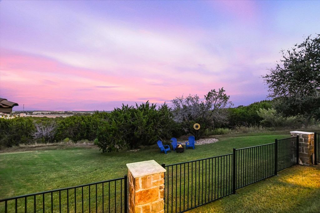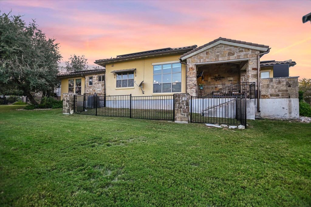Located at the front of the highly desirable Falconhead neighborhood, this one-story home is a true standout. Its beautiful stone exterior, tile roof, lush landscaping, and welcoming covered porch create instant curb appeal. Inside, expansive windows flood the living room, kitchen, and primary suite with natural light and showcase absolutely stunning panoramic Hill Country views. High ceilings enhance the open, airy layout, while three spacious bedrooms plus an office/flex room provide plenty of versatility. Designed for modern, low-maintenance living, this lock-and-leave home offers the perfect balance of comfort and style. The covered back patio is an ideal spot to enjoy your morning coffee or unwind at sunset. Expansive backyard offers plenty of space for entertaining, with a fenced dog run ideal for pets. Whether entertaining indoors or relaxing outdoors, this home delivers the best of both worlds. It's ideal for busy professionals, retirees and/or a second home for those seeking convenient access to restaurants, healthcare, shopping, and the Falconhead Golf Club. Special features include owned solar panels"”with electric bills averaging just $0-$30 over the past six months. HOA fees cover landscaping (front and back), irrigation water, community maintenance, and access to the neighborhood pool and clubhouse. This condo is truly a rare gem!