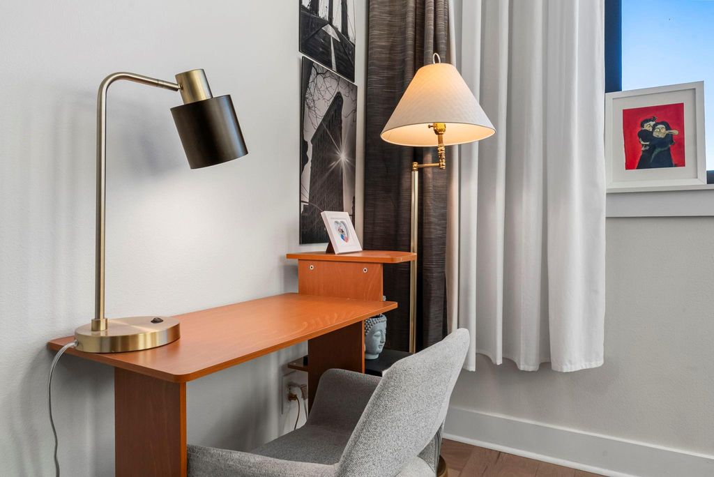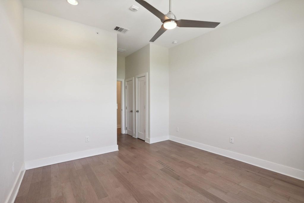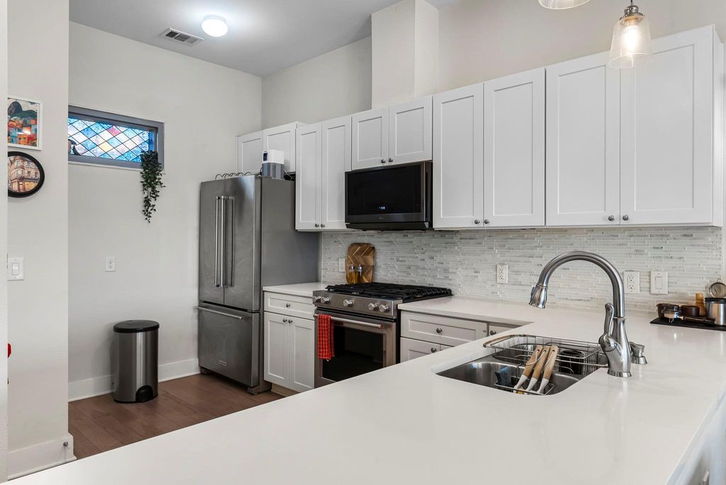 Gorgeous condo with open-concept living, wood floors throughout, high ceilings, and recessed lighting. The kitchen features shaker-style cabinetry, quartz countertops, stainless steel appliances, and a gas range. Stackable washer and dryer are conveniently located in the kitchen along with a pantry. The primary bedroom offers a ceiling fan and two walk-in closets. Additional highlights include a tankless water heater, coat/shoe closet at the entry, and a private balcony. One assigned garage parking space included (#23). Google Fiber and AT&T Fiber available. Pets allowed with deposit and monthly pet rent. Flexible move-in timeline with 2 weeks notice. Apply with RentSpree: https://apply.link/O0Bzf5o.