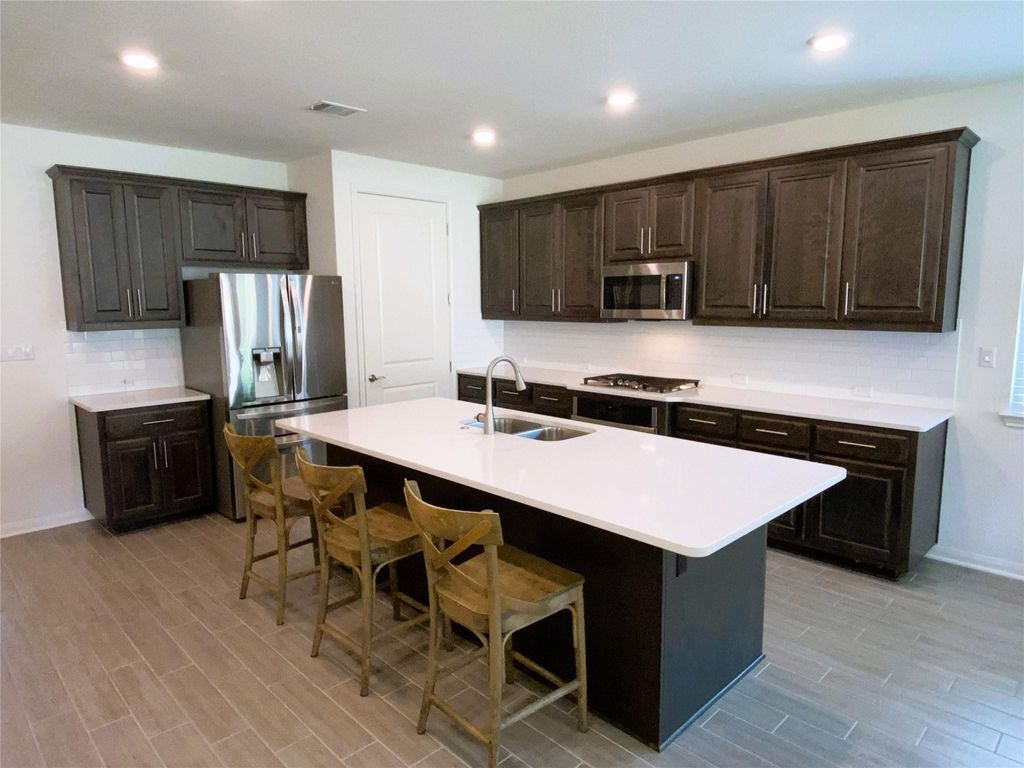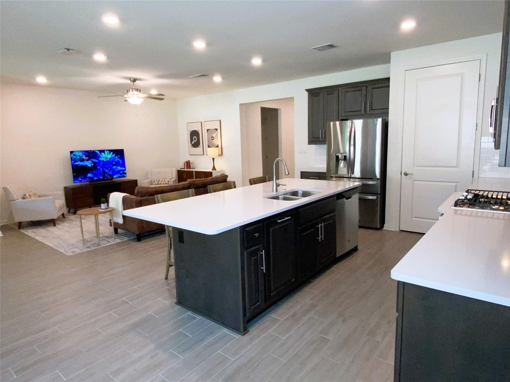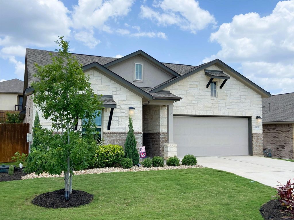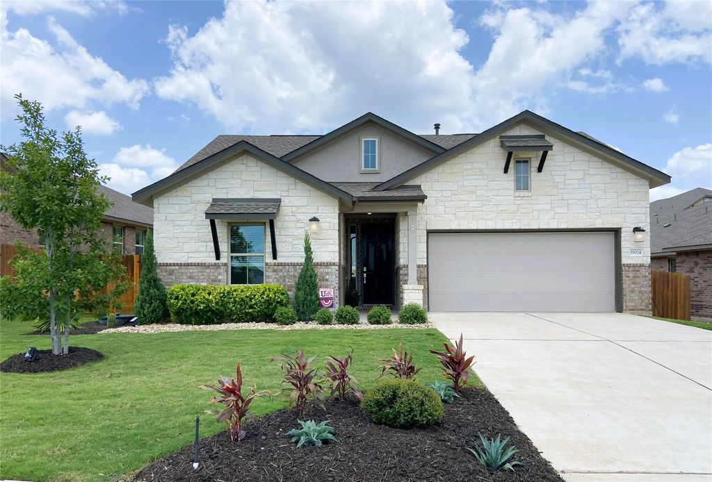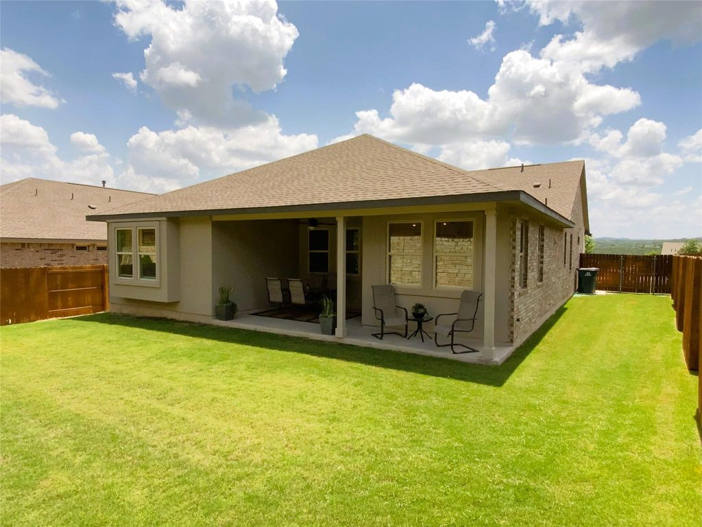 Brimming with curb appeal, this immaculate single-story home is tucked away on a quiet street in the desirable Sweetwater community. Inside, you'll find an inviting open-concept layout with crisp white walls, high ceilings throughout, and gorgeous tile flooring that brings warmth and style to the space. The living area is filled with natural light and opens seamlessly to a stylish kitchen featuring a large center island with breakfast bar, quartz countertops, classic subway tile backsplash, walk-in pantry, and upscale GE stainless-steel appliances including a gas cooktop and built-in oven. A sunny dining space just off the kitchen is perfect for hosting friends and family. The spacious primary suite offers oak flooring, a tray ceiling with recessed lighting, a large walk-in closet, and a spa-like en-suite bath with a quartz-topped double vanity, brushed nickel hardware, and an oversized walk-in shower with subway tile surround, hex tile flooring, and a bench seat. Two well-sized secondary bedrooms, a full guest bath, and a large laundry room with added cabinetry round out the smart floorplan. The home also features a clean 2-car garage with extra storage space"”perfect for organizing tools, gear, or seasonal items. Step outside to a freshly stained fenced backyard with an extended covered patio"”ideal for relaxing, grilling, or entertaining. Additional updates include a brand-new garbage disposal. Enjoy being just a short walk from the Overlook Club and top-notch community amenities, including two pools, a playground, fitness center, and scenic walking/hiking trails. Located in a rare natural gas community and zoned to acclaimed Lake Travis schools"”just 10 minutes to the Hill Country Galleria. Schedule your showing today!