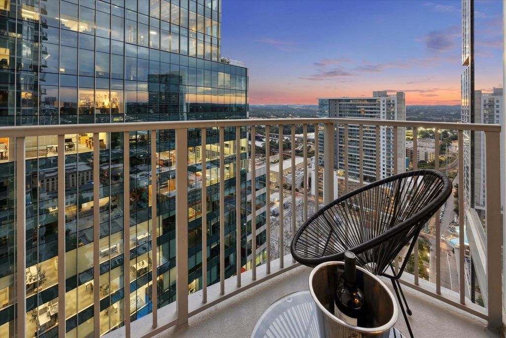 Beautiful Southwest facing corner condo at 360 Condominiums. Truly stunning panoramic views of Downtown Austin & Lady Bird Lake from 2 balconies! This 2 Bed / 2 Bath condo features hardwood flooring, floor to ceiling windows with tons of natural light streaming through and no neighbors on one side. Rare opportunity to have a balcony off of the living room and another balcony off of the primary suite. LARGE STORAGE UNIT INCLUDED AND PRIME PARKING! Enjoy building amenities including 24 hour concierge, owner's lounge, game room/conference room, resort style pool deck, fitness center and dog park. Unbeatable location just steps from it all! Walk to Lady Bird Lake, 2nd St District, Trader Joe's, Whole Foods & so much more. Downtown living at its finest! High speed internet included with HOA!