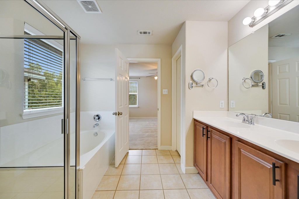Welcome to a move-in-ready home tucked in a quiet, tree-lined neighborhood near a small community park. This spacious layout offers high ceilings, natural light, and flexible living with a dining or office space. Enjoy the convenience of a prime location between I-35 and Mopac, making your commute simple and your weekends easy. Step outside to a covered porch perfect for morning coffee or relaxing evenings. With guest parking nearby and a peaceful community feel, this home blends comfort, accessibility, and everyday ease.