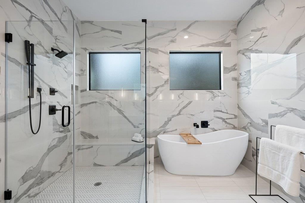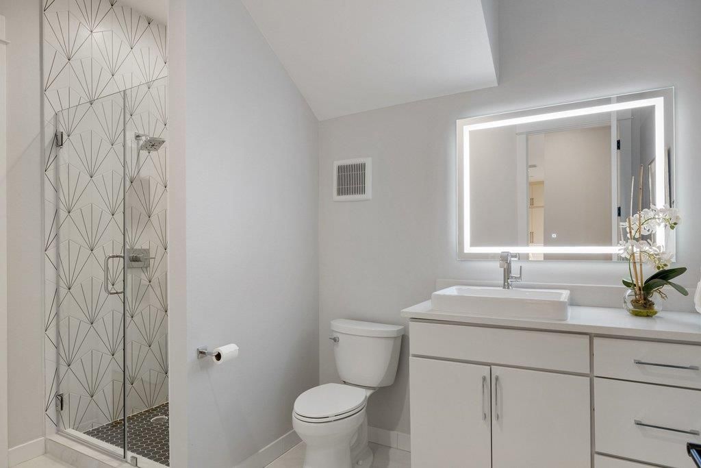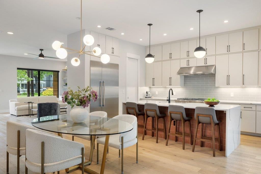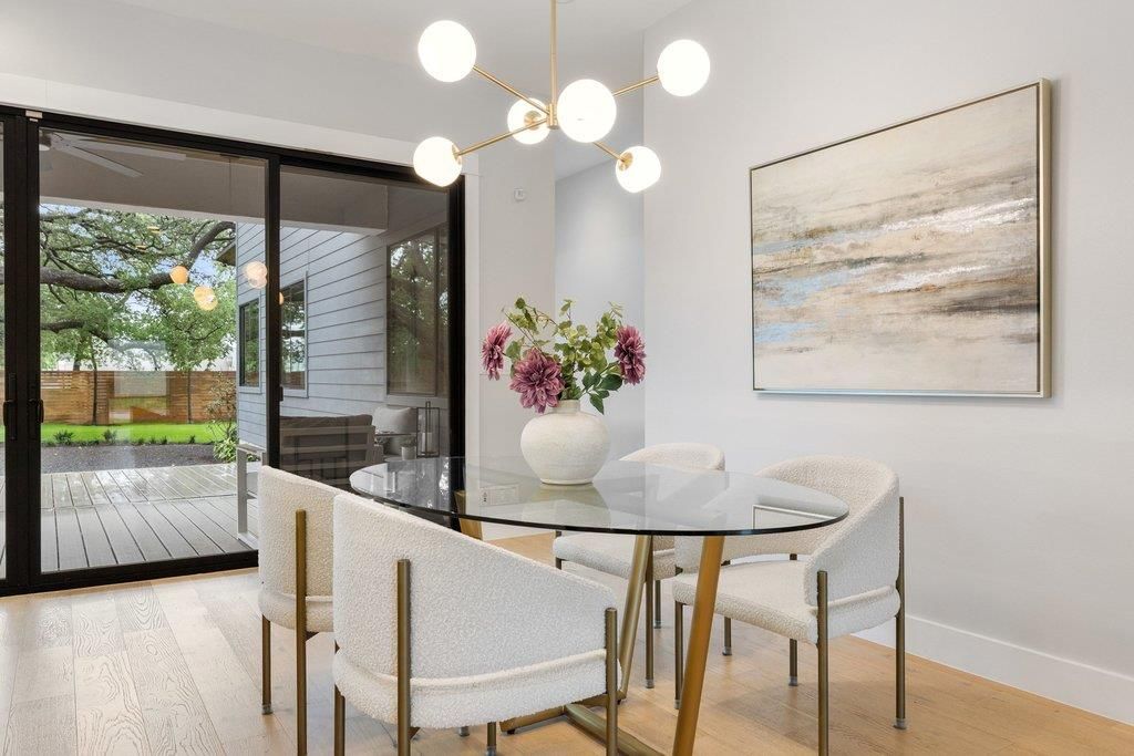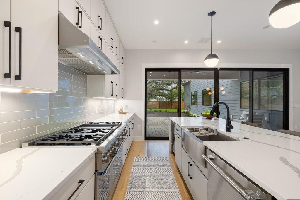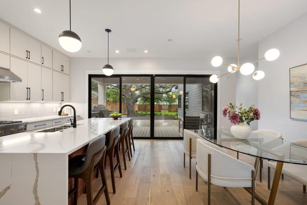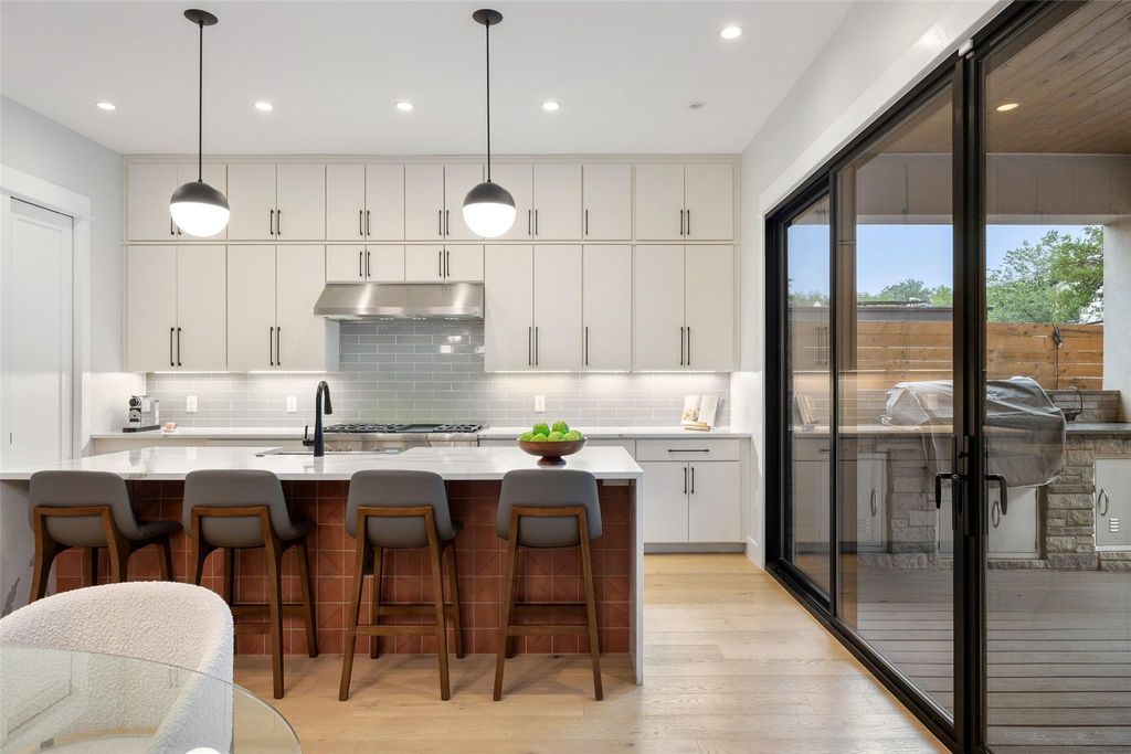 In the heart of Shoalmont and crowned with a standing seam metal roof, this Lohr Homes contemporary delivers the kind of everyday living that feels effortless from the moment you arrive. Mornings begin with sunlight pouring through walls of glass and coffee at the waterfall island, where designer terracotta tile grounds the bar and adds warmth to a kitchen built to perform. Thermador appliances and full-height cabinetry keep even simple routines feeling elevated. The main living space anchors around a floor-to-ceiling fireplace, flanked by custom built-in shelves that add both storage and a quiet sense of craft. Sliding glass doors open wide to the home's true highlight: a backyard built for living. The covered patio flows to a built-in outdoor kitchen and an extended composite deck with built-in seating, all canopied by a huge heritage oak. The freshly sodded lawn leaves plenty of room for a pool and an ADU. The primary suite sits privately at the rear of the the main level, calm and light-filled, with a soaking tub, glass shower, recently upgraded lighting, and a generous walk-in closet. A 2nd main-floor bedroom with its own bath flexes beautifully as a guest room or home office. Upstairs, a den gives the household space to spread out, joined by three bedrooms. One has its own dedicated bath, and the other two share a well-planned bath with separate vanities. A stackable washer and dryer adds a second laundry location. You are minutes from some of Austin's most loved spots. Dinner at The Peached Tortilla, burgers at Hat Creek, Saturday morning runs to Voodoo Doughnut. Burnet Road's coffee shops, restaurants, and patios are right there, and downtown, The Domain, and major employers are all an easy drive. The attached garage includes an EV charger ready for the way you live now. Shoalmont has long been one of Austin's most established neighborhoods, with tree-lined streets and a true sense of community. This is the home that lets you live in it fully.