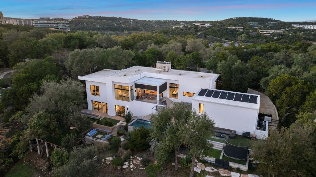 Set on a secluded 2.04-acre bluff, crafted by award-winning architect McKinney York"”this residence offers a rare blend of contemporary sophistication and Hill Country serenity. Designed to embrace its natural surroundings, the home features expansive floor-to-ceiling lanai doors in both the living room and primary suite that retract completely, dissolving boundaries and opening the interiors to sweeping views of Wild Basin Preserve. The outdoor experience is exceptional and thoughtfully layered. The backyard unfolds across professionally terraced spaces with level turf, integrated planters, private woodland trails, and a dramatic gas fire pit positioned toward the valley. A remarkable 1,400 sq ft treehouse deck winds around mature oaks, creating a floating outdoor living space unlike anything else. A 500+ sq ft louvered pergola with motorized shade enhances year-round entertaining, while a heated pool with commercial-grade and solar systems ensures comfort in any season. Inside, the home's clean, modern aesthetic is elevated by rich natural materials. A striking Leuders limestone fireplace anchors the main living area, creamy quartzite defines the kitchen and baths, and a sculptural glass-and-steel staircase adds architectural impact. The expansive indoor-outdoor all-weather terrace serves as the central gathering space, seamlessly connecting living, dining, and outdoor areas. A gourmet kitchen, dedicated office, media room, and en-suite guest suite complete the main level. The primary suite offers a private retreat with panoramic views, a spa-like bath, and an oversized custom dressing room that includes a dedicated cardio nook and its own washer and dryer. The lower level provides two additional bedrooms, a full bath, a media/playroom with terrace access, a full laundry room, and a dog wash station. Recent luxury upgrades"”including multi-zone audio, PDLC smart-tint glass, premium water systems, and a whole-home generator"”this estate delivers turnkey comfort.