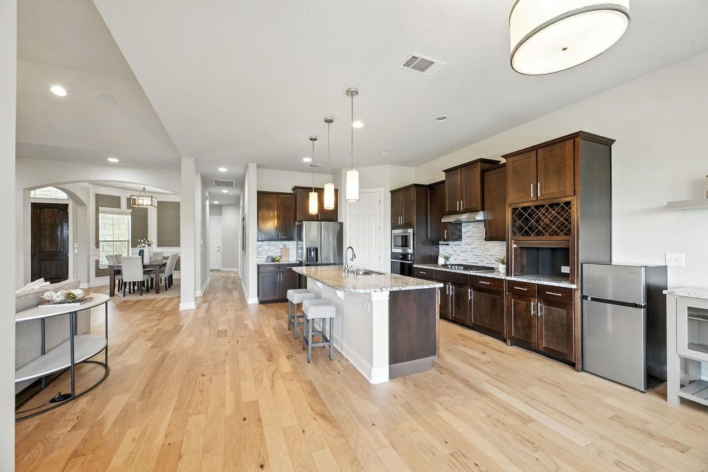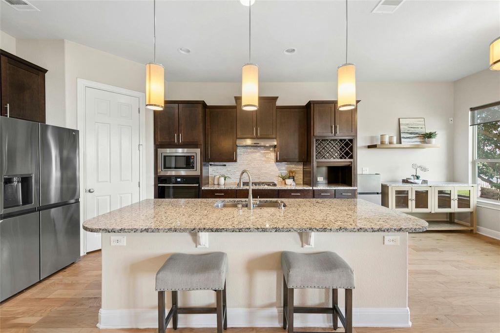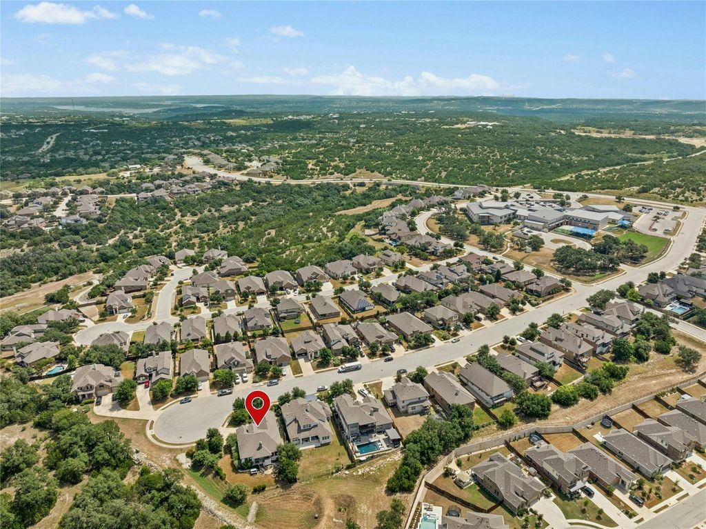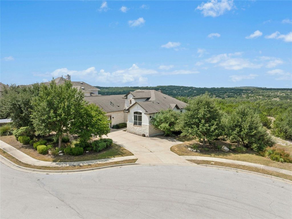 Hill Country living at its finest with privacy, views, and unforgettable sunsets. Nestled on a quiet cul-de-sac, this 4-bedroom, 3-bath, 2,382 sq. ft. home sits on a .274-acre lot that backs to a serene greenbelt. Expansive windows invite natural light and frame breathtaking Hill Country views, perfect for morning coffee or evening sunsets accompanied by the sounds of nature. The open-concept floor plan blends elegance and functionality with a cozy fireplace and custom built-ins. The remodeled primary suite is a spa-inspired retreat featuring dual vanities, a soaking tub, and a walk-in shower, while recent updates"”including fresh paint and new carpet throughout, create a fresh, modern ambiance. Step outside to a covered cabana and outdoor kitchen designed for effortless entertaining and dining al fresco. West Cypress Hills offers a community pool, playground, basketball court, soccer field, and trails for walking and hiking. Walking distance to West Cypress Elementary and minutes from Lake Travis ISD's new second high school (opening 2028), this home combines lifestyle, convenience, and a setting that is truly extraordinary.