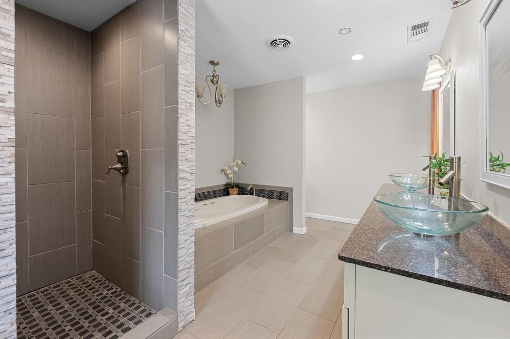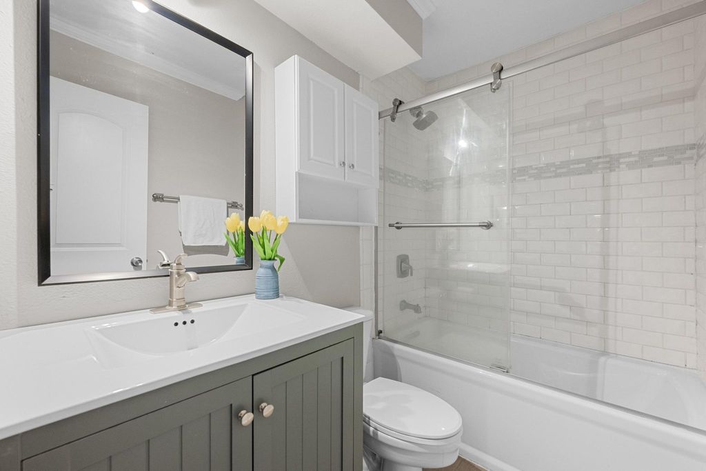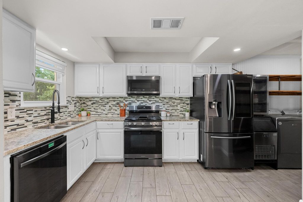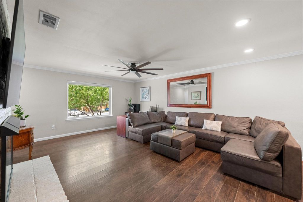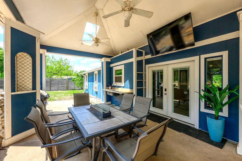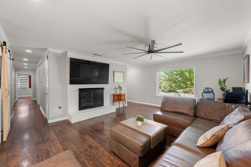 Set on a near quarter-acre picturesque lot, this renovated residence blends modern style, recreational space and tranquility in sought after Oak Plantations! This exceptional residence has 3 bedrooms, 2 full baths, a modern kitchen, an inviting living room, a luxurious primary bath, a large covered entertainment porch, a covered side porch for work or recreation, and a cool home gym! The chef will enjoy the updated kitchen with granite counters, white cabinets, newer Samsung appliances, and a walk-in pantry. This home was made for entertaining with a huge dining area, and a grand covered back porch with a built-in cook's work station and a large screen TV area, and all overlooking the enormous rolling green back yard. Every detail of the home is designed to inspire a modern and relaxed lifestyle. The living room is supremely inviting with a white brick fireplace, and a picture window overseeing the landscaped front yard. Retreat to the primary suite and a stunning wow-factor primary bath with a granite dual vanity, a lavish soaking tub, & a spacious walk-in shower. Guests will enjoy the modern white-tiled 2nd full bath & contemporary vanity. Other impeccable details of the residence include new windows, updated fixtures, recessed lighting, contemporary flooring, barn doors, all cedar closets, a modern exterior, & a newer roof, HVAC and water heater. The fantastic garage home gym is negotiable, or can be removed. The garage has a split-system AC, could be used as a media/flex room; garage SF not included in the home's 1534 SF. A true jewel of the home is the vaulted covered back porch with 2 skylights, 2 ceiling fans, and a grill area, all perfect for relaxing with a serene private view of the expansive backyard. Stellar location, less than 5 miles to DT Austin, and close to shopping, bars and restaurants! A HUGE bonus, nearby Longview Park & the 147-acre Stephenson Nature Preserve! This exceptional residence extends a living experience of vibrancy and tranquility.