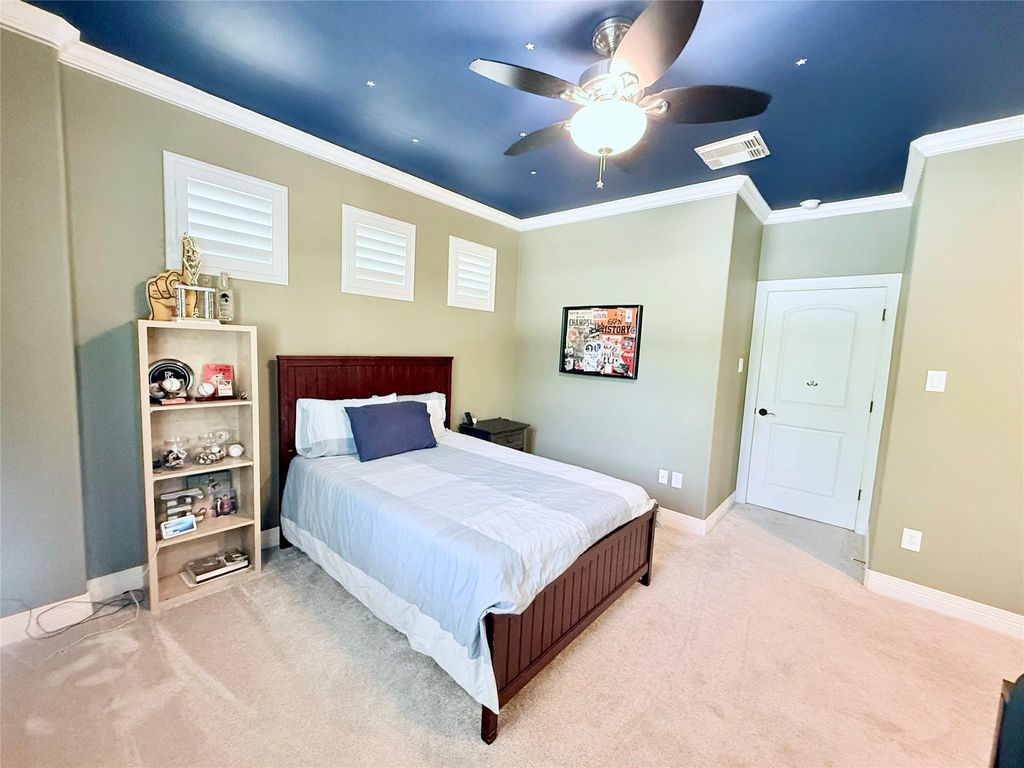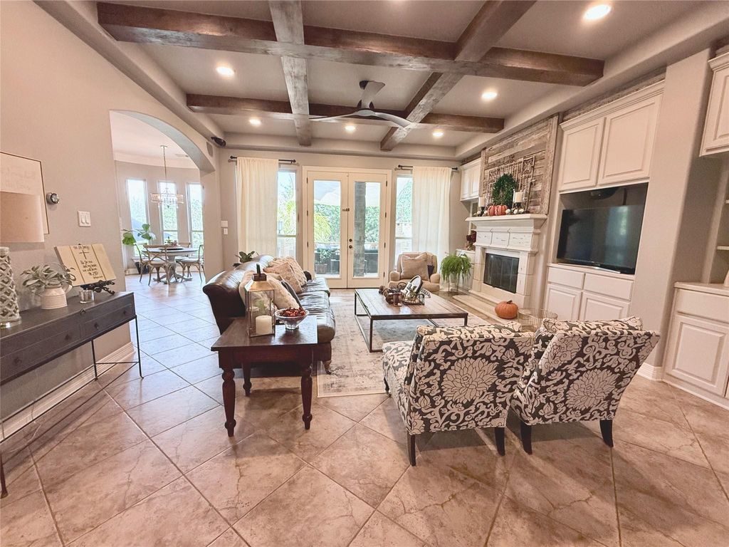 INTERIOR | Beamed Ceilings, Bookcases, Ceiling Fan(s), Chandelier, Coffered Ceiling(s), Crown Molding, Double Vanity, Entrance Foyer, Granite Counters, High Ceilings, High Speed Internet, Kitchen Island, Master Downstairs, Open Floorplan, Pantry, Recessed Lighting, Tray Ceiling(s), Walk-In Closet(s), Wet Bar, Wired for Sound |