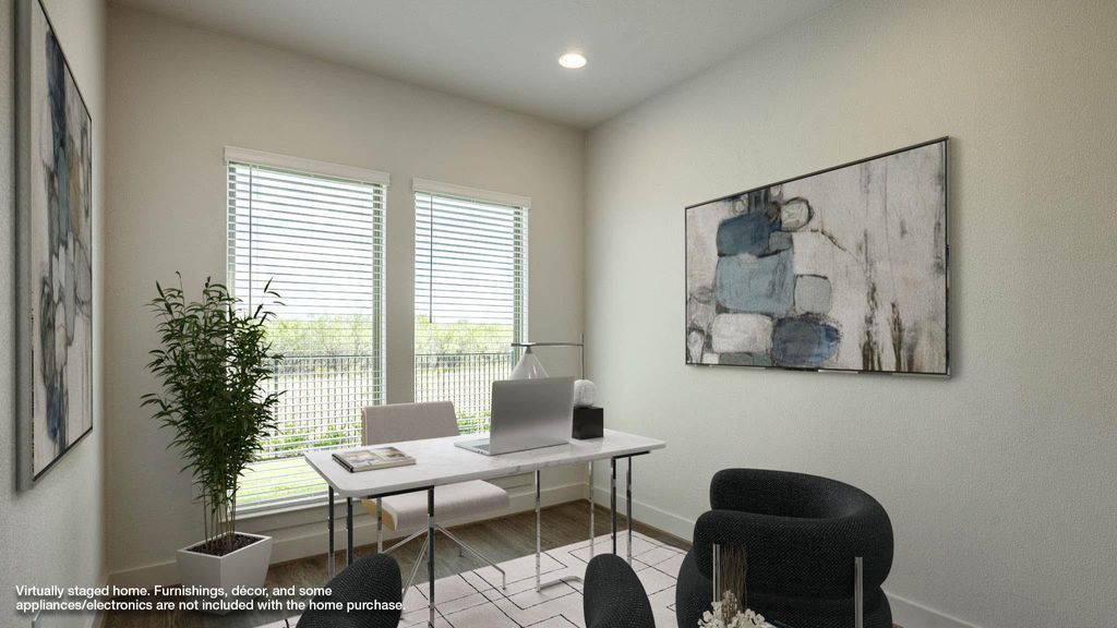 READY FOR MOVE-IN! Entryway opens into an elongated hallway lined with windows. The utility room and additional storage space are at the front of the home. The family room boasts a wall of windows. Connecting to the space is the dining area. The kitchen features an island with built-in seating, a corner walk-in pantry, and access to the covered patio. At the rear of the home is a secluded home office which features French doors. The primary bedroom boasts a wall of windows overlooking the backyard space. Double doors lead into the primary bathroom which hosts dual vanities, a large glass enclosed shower, and a walk-in closet. Off the main living area are the two secondary bedrooms which have their own walk-in closet and a shared bathroom. The mud room is off the two-car garage.