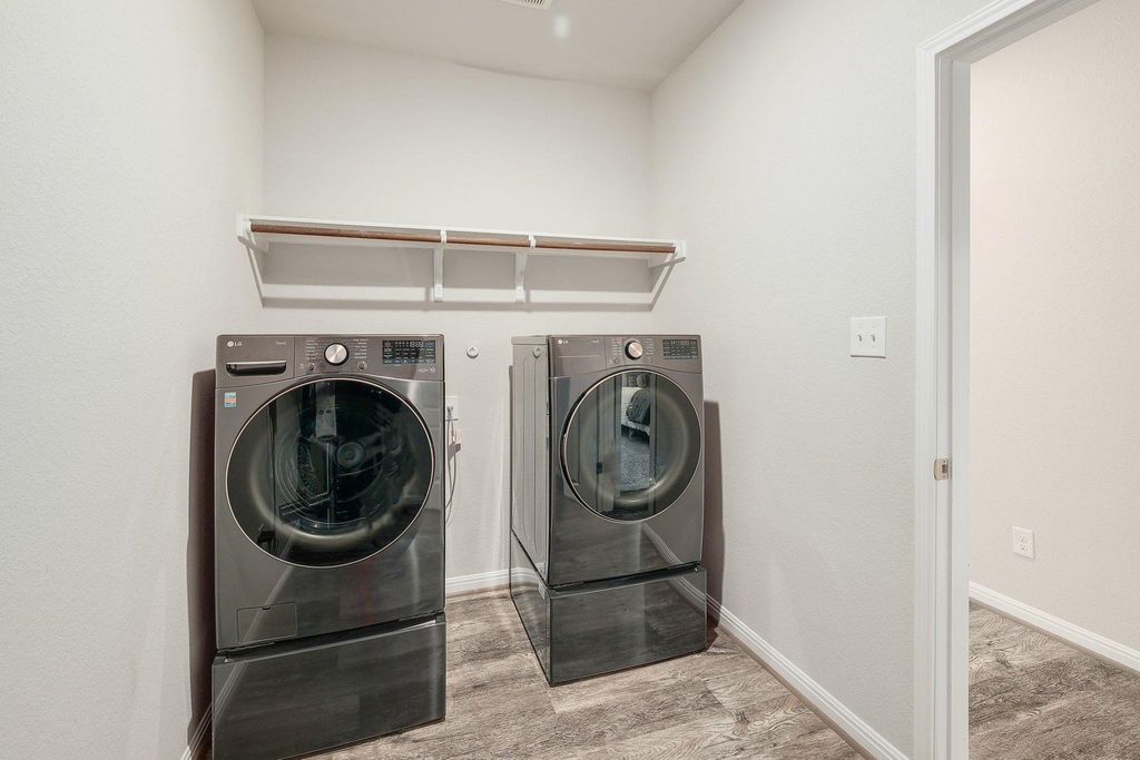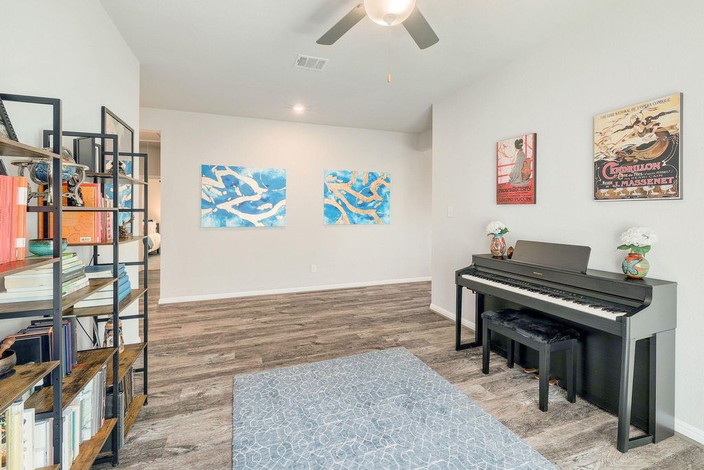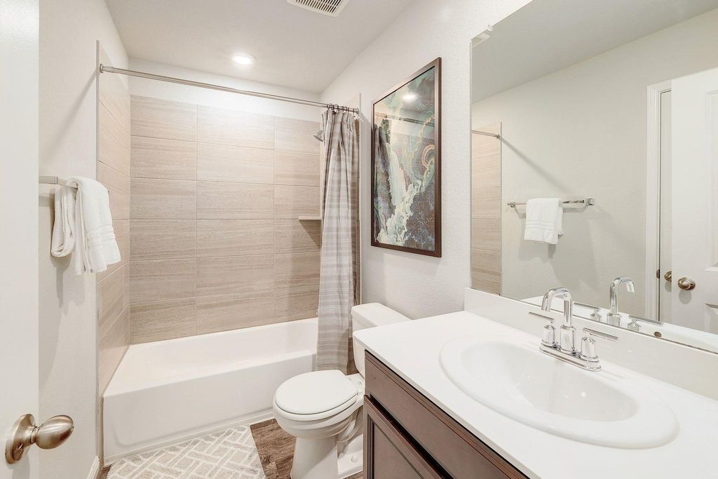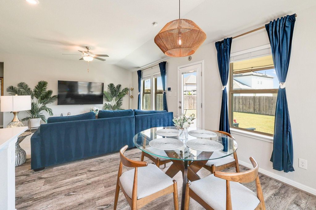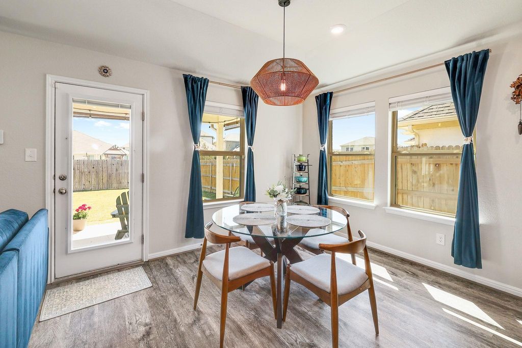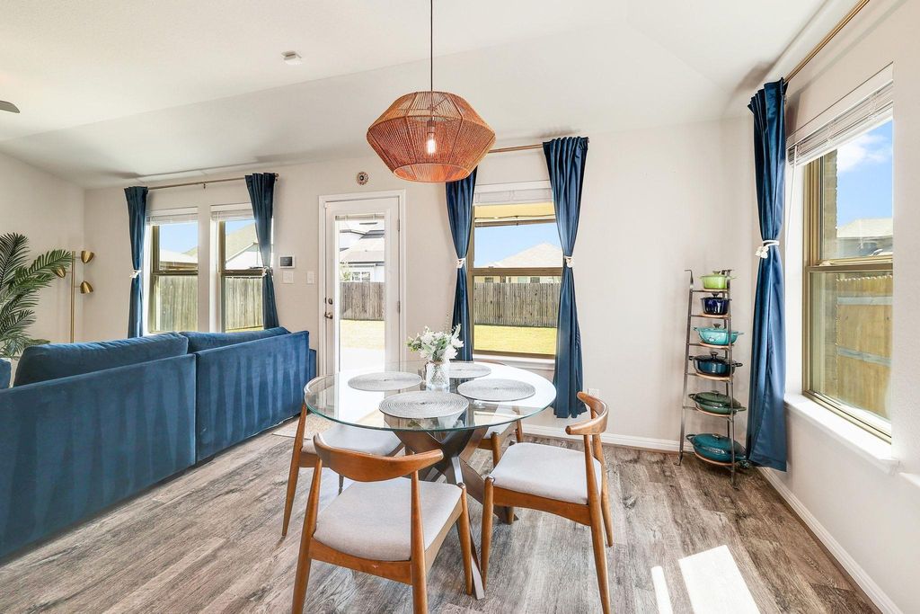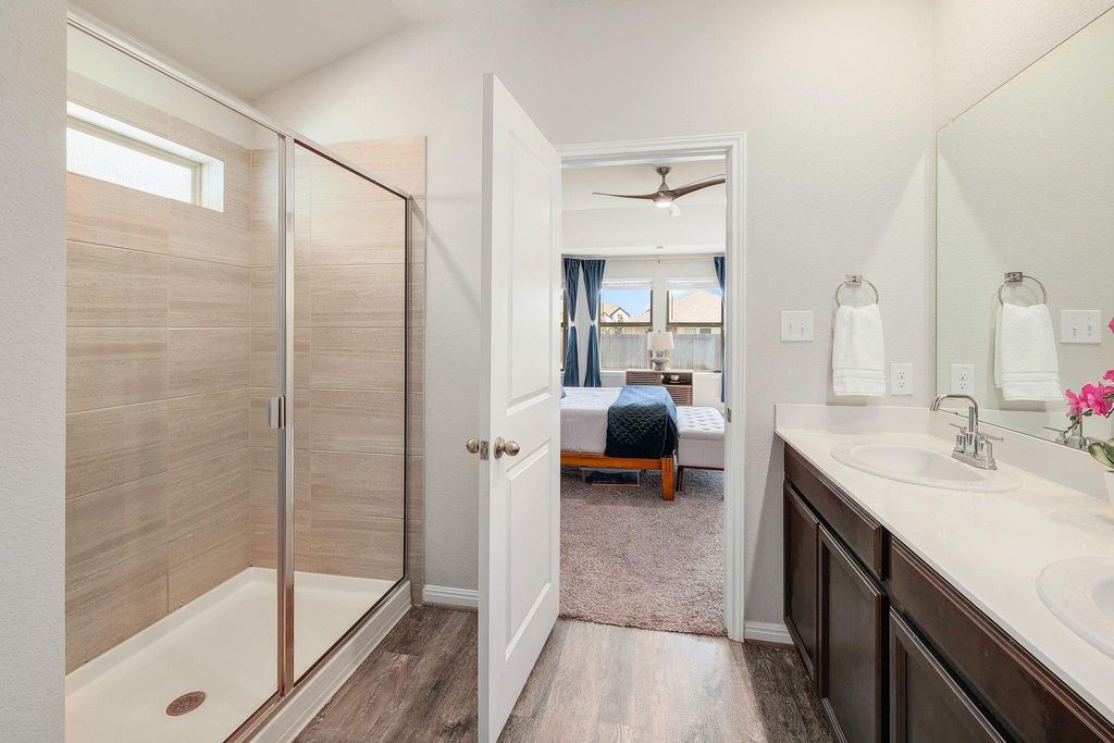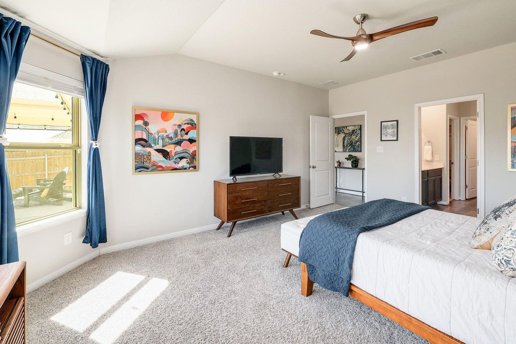 Stunning 4-bedroom, 3- full bath single-story home blends modern design with energy efficiency. Inside, you'll find beautiful luxury vinyl plank flooring throughout the main living areas with soft carpet in the bedrooms. The smart floor plan includes a spacious primary suite, two guest bedrooms, a versatile flex space, and a fourth bedroom with its own ensuite bath"”perfect for guests or multigenerational living. The primary suite offers double vanities, large bay window exposure and a massive walk-in closet. The open-concept kitchen features elegant jasmine white quartz countertops, rich espresso cabinetry, a gas range, and flows seamlessly into the bright and inviting living area"”ideal for entertaining. Step outside to the extended slab patio and level backyard, ready for relaxing evenings or outdoor gatherings. Additional highlights include a luxury water softener and filtration system, AT&T Fiber internet, and spray foam insulation for exceptional energy efficiency and lower utility bills.