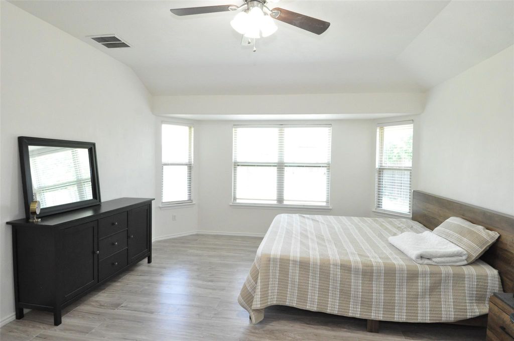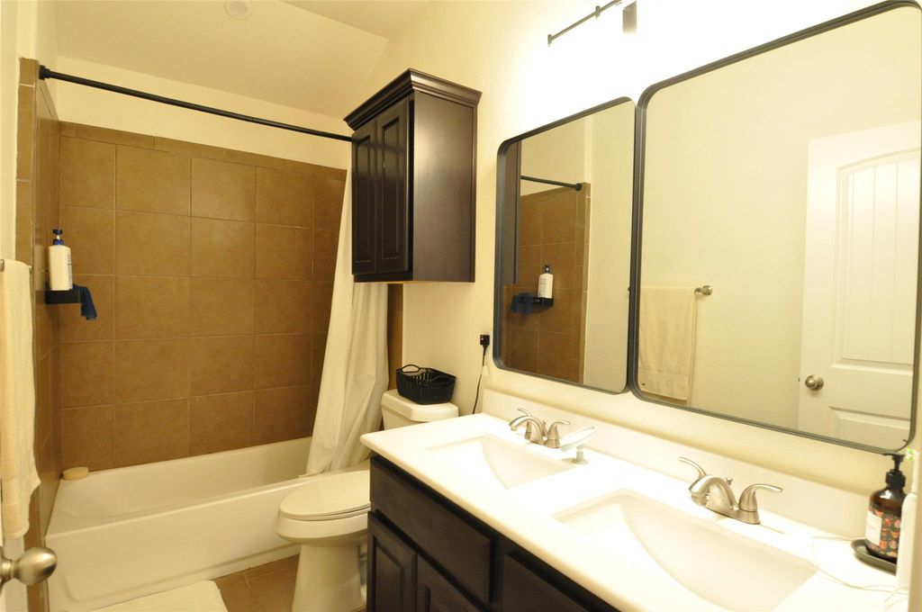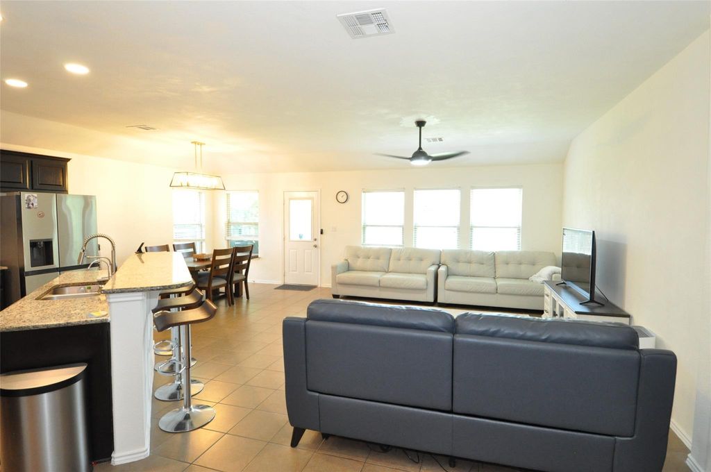 Discover this thoughtfully designed 2015 home in the coveted Reserve at Westcreek neighborhood. A new roof was installed in 2021. Sip morning coffee on the inviting front porch, creating a friendly atmosphere with neighbors. Host gatherings in the expansive central area featuring generous countertops, a breakfast bar, and a wall of windows illuminating the living/dining space. Escape to the primary bedroom adorned with tray ceilings and French doors leading to a luxurious bathroom, boasting double vanities, an oversized walk-in shower, a walk-in closet, and a private water closet. Additional Upgrades: No carpet/laminate and tile throughout, Stunning granite kitchen countertops with a breakfast bar open to living and dining areas, Upgraded Whirlpool stainless appliance package (dishwasher, glass cooktop range with self-cleaning oven - 2018, microwave/hood combo - 2021, disposal - 2020), Recessed lighting in the kitchen, Elegant molding on all kitchen upper cabinets, Fresh interior washable paint (July 2020), upgraded interior doors, Rounded sheetrock corners, Decorative archways throughout, Garage door replaced in 2020, Master bedroom carpet replaced (2023). The covered back porch offers shade for observing kids or pets playing in the private backyard. The charming neighborhood features an amenity center/clubhouse with a 24-hour fitness center, tech room, game room, rentable party room, pool, playground, tennis court, and basketball court. Experience a home filled with updates and upgrades, combining style and comfort for modern living.