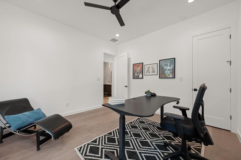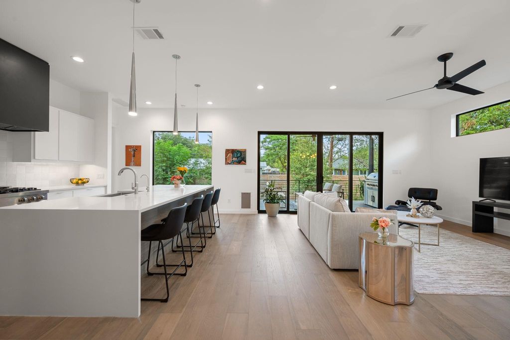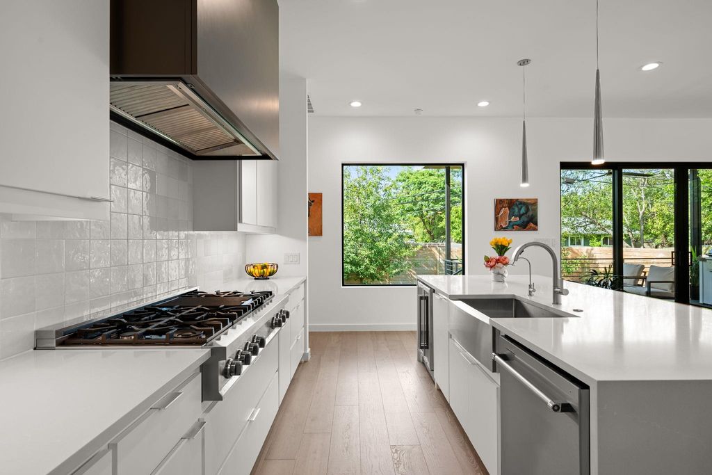 Experience modern luxury in this like-new custom residence, completed in 2023, perfectly positioned in one of Austin's most walkable and vibrant neighborhoods. Showcasing 4 bedrooms and 3 full baths across two levels, this thoughtfully designed home combines refined elegance with everyday livability. Soaring 10-foot ceilings on the main floor and 9-foot ceilings upstairs invite an abundance of natural light, creating a sense of spaciousness and sophistication throughout. The chef's kitchen is a true centerpiece, featuring a professional-grade 48-inch gas cooktop, oversized quartz-topped island, walk-in pantry, and bespoke cabinetry. Wide-plank oak floors flow seamlessly from room to room, setting a timeless foundation for the home's modern aesthetic. The primary suite, privately positioned on the main level, offers a serene retreat with a spa-inspired bath boasting dual shower heads, a freestanding soaking tub, and a custom walk-in closet with built-in dressers. A guest suite is also conveniently located on the first floor, while upstairs provides additional bedrooms and a flexible loft space for work, play, or relaxation. Designed for effortless entertaining, the covered outdoor deck is complete with a built-in kitchen and overlooks a fully fenced yard with automated irrigation. Energy-efficient details"”spray foam insulation, tankless water heater with recirculating loop, and EV-ready garage"”ensure modern comfort with sustainable sensibility. Set on a quiet street, yet just steps from Alamo Drafthouse, Starbucks, Bartlett's Steakhouse, the Domain and a variety of other local cafes and restaurants, this home delivers the rare blend of luxury living and unbeatable convenience. A one-year interest rate buy-down is available with preferred lender, making this extraordinary opportunity even more attainable. For more info, go to: https://wkf.ms/45P3k9p