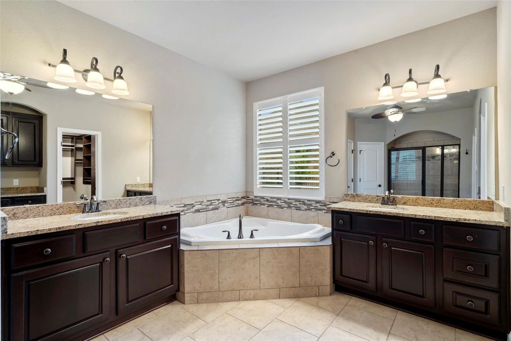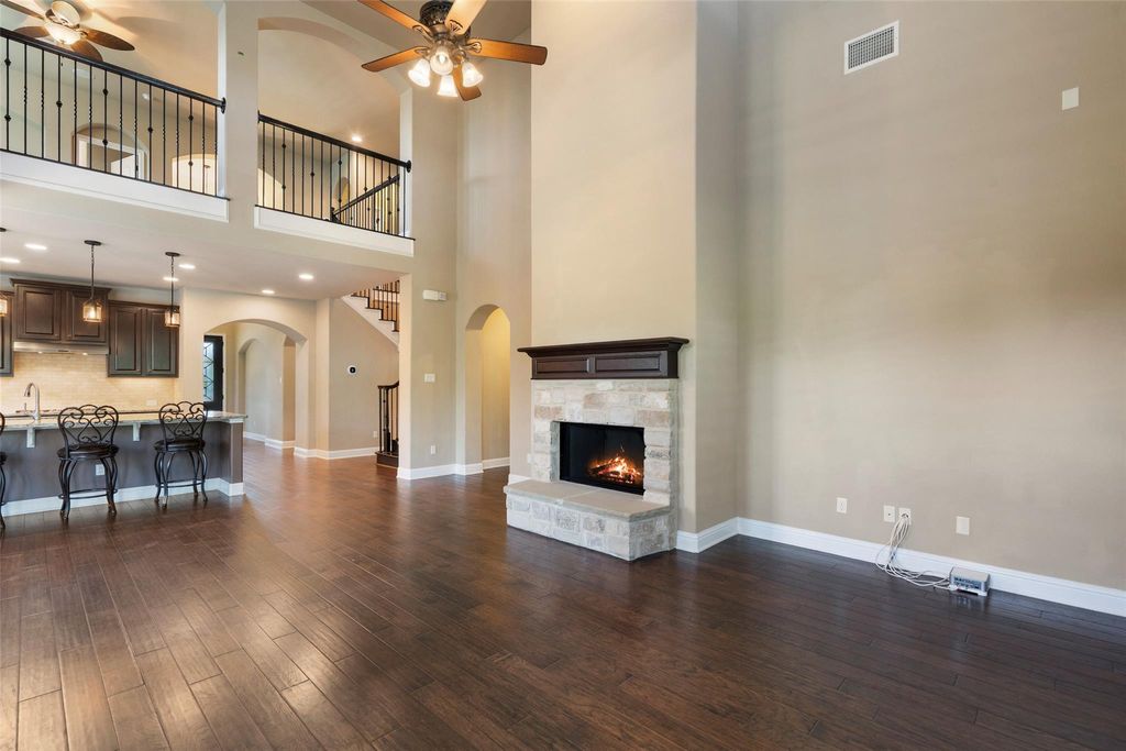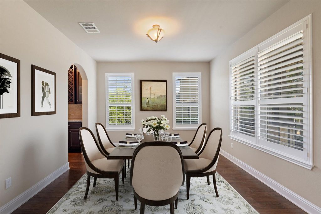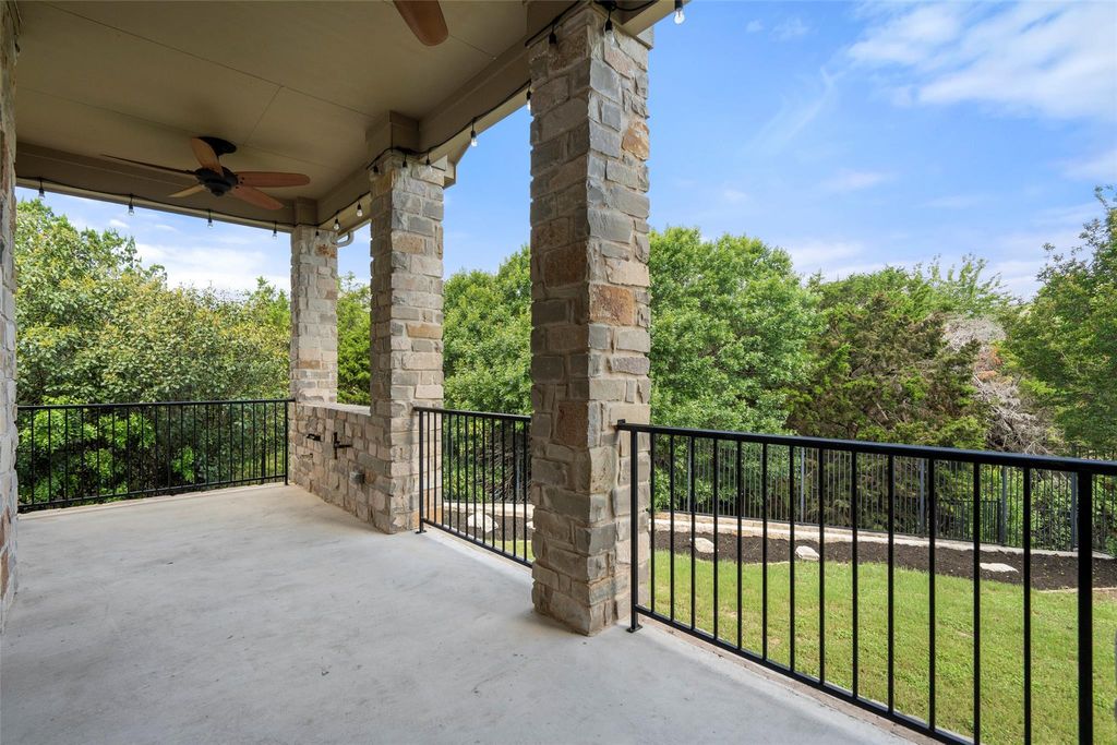 Discover this exceptional home on a spacious cul-de-sac lot in the highly sought-after Rough Hollow community. With a new roof installed in 2024, this property offers both peace of mind and impressive upgrades, including a sports court and expansive outdoor pavilion added in 2021"”perfect for entertaining. There's still room to add a pool, and the private backyard backs to a lush green area, offering serene views of nature. Inside, the thoughtfully designed layout features two bedrooms and two full baths on the main level, ideal for multi-generational living or a dedicated home office. The soaring ceilings in the family room create an open, airy feel that flows seamlessly into the kitchen with granite counters, wood flooring, and plantation shutters throughout. Upstairs, enjoy a large game room, three spacious bedrooms, and two additional full bathrooms, providing ample space for a growing family or guests. The home also offers California Closets in every bedroom, maximizing your storage. The 3-car garage adds extra convenience with fantastic storage options. This home is the perfect blend of luxury, flexibility, and Hill Country lifestyle"”don't miss it!