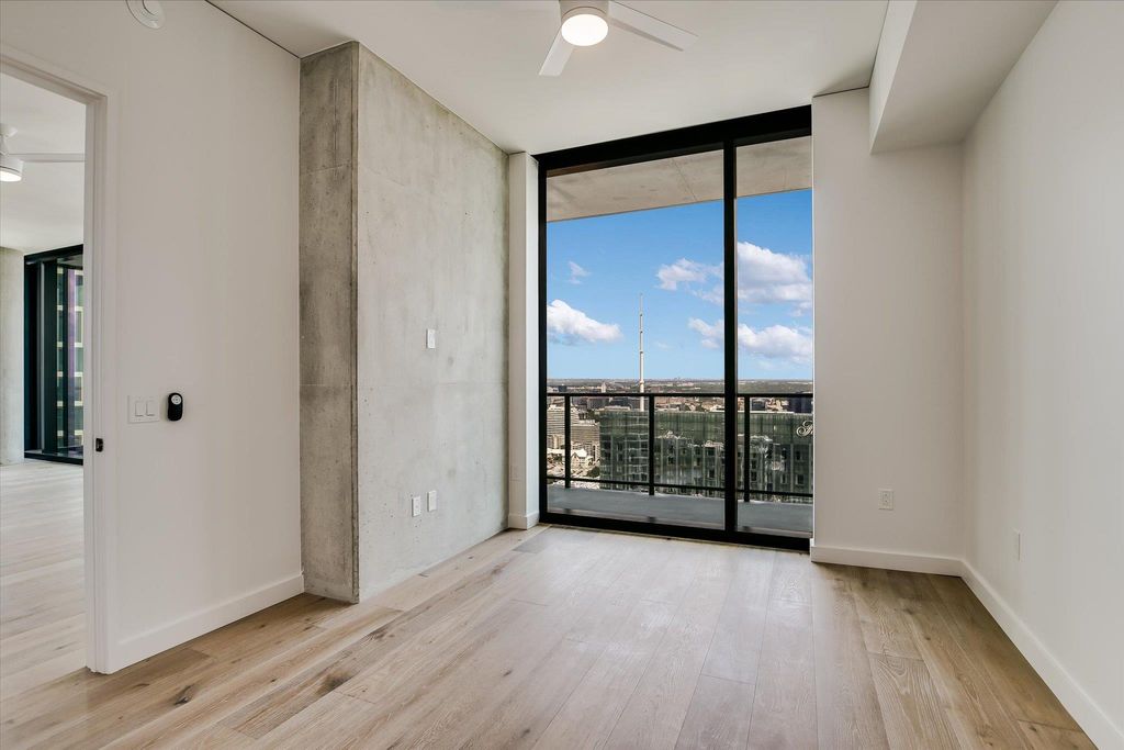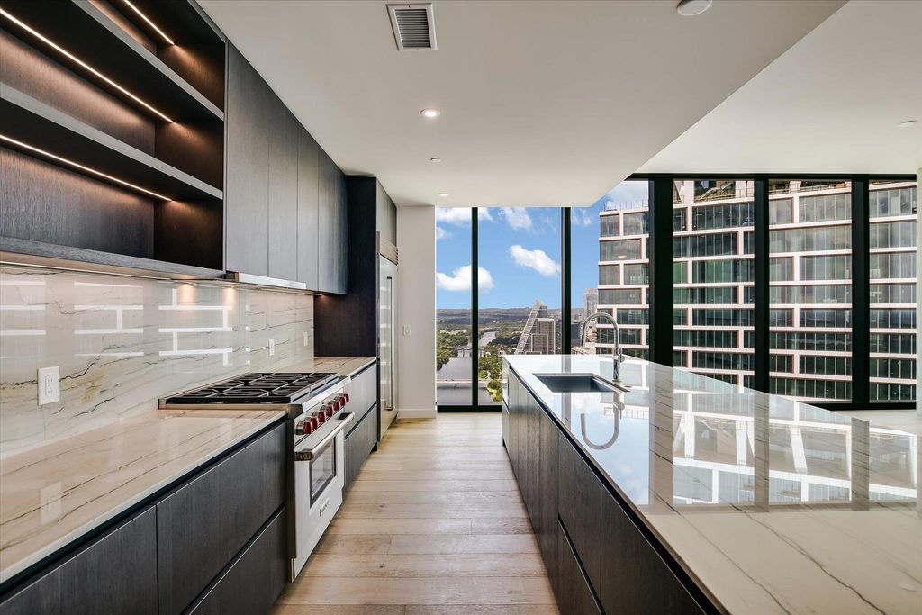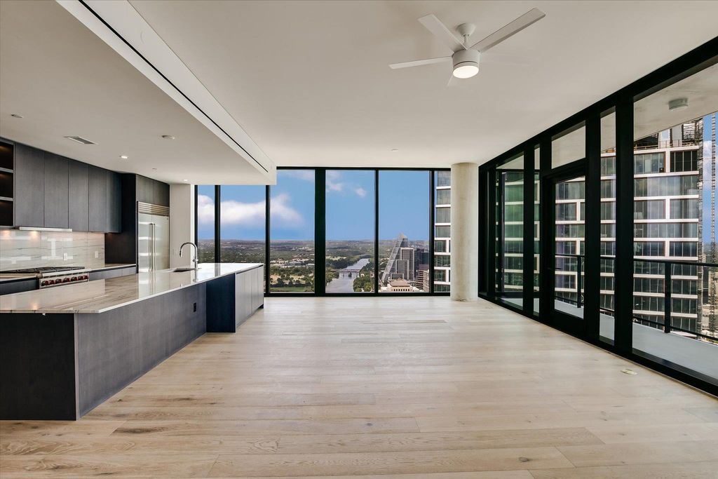 This 3-bedroom, 3.5-bath residence on the 44th floor of The Modern Austin Residences offers 2,324 square feet of refined interior living space and a 222-square-foot private balcony showcasing sweeping views of Lady Bird Lake, the Austin skyline, the State Capitol, and the Hill Country. Expansive floor-to-ceiling windows fill the home with natural light, accentuating elevated finishes and a seamless open-concept design. The chef's kitchen is appointed with light quartz countertops, an upgraded full-height backsplash, and premium Wolf appliances. An upgraded wet bar enhances the space for effortless entertaining. Additional highlights include wide-plank hardwood flooring and two premium parking spaces with an EV charger. Residents of The Modern enjoy over 19,000 square feet of curated amenities across three levels, including a 25-meter lap pool and spa, fitness center, yoga studio, sky lounge, indoor and outdoor lounges, dog park, business center, and 24/7 concierge service. Perfectly located in the Rainey Street District, The Modern offers unmatched access to Austin's best dining, nightlife, and the Lady Bird Lake trail. Now available. Contact for a private showing and more details.