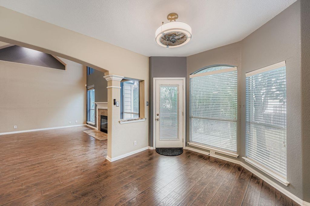 READY TO MOVE-IN! This spacious 4-bedroom, 2.5-bathroom two-story home is located on a cul-de-sac in the Harris Branch community, offering a big fenced backyard, large patio, and a storage shed. The family room features cascading ceilings that reach the upper level, large windows that fill the space with natural light, and a cozy fireplace with views into the eat-in kitchen and breakfast nook. The kitchen comes equipped with stainless steel appliances, while formal dining and living rooms provide additional entertaining space. The main-level primary suite includes dual sinks, a walk-in shower, water closet, and a jetted tub. Upstairs, a bonus room offers flexible space for a game room, playroom, or home office. Harris Branch residents enjoy access to a clubhouse, lake, playground, pool, tennis courts, and more, with convenient proximity to Downtown and major highways. Discounted rate options and no lender fee future refinancing may be available for qualified buyers of this home.