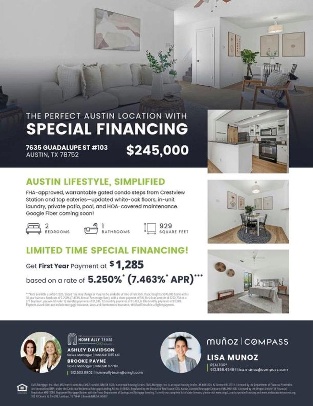 **Please make sure all doors are locked when leaving** $5,000 grant available through PNC Bank! Ask us for more details OR secure this property with a first year monthly payment of $1285! Lender offering to pay for interest rate buy-down so you can secure this home at 5.20% for your first year! Here's that Austin lifestyle you've been looking for! A place to call your own without having to sacrifice on the location. The gem of a community is quiet and tucked in just enough to feel like a peaceful retreat but still in the mix of it all. With more restaurants, coffee and fun than you can name, you're never far away from delights like Little Deli, The Brewtorium, Michi Ramen, and 99 Ranch Market! Easy access to the rail at Crestview Station, and just a short ride to UT, Downtown, and more. You'll move right in with piece of mind knowing that the HOA takes care of roof, siding, water, trash, sewer, and recycling here! Google Fiber is set to come later this year! The condo is warrantable and FHA approved for buyers. This home features updated LVP white oak flooring throughout the bottom level and a private covered patio. The downstairs areas are spacious and there are washer/dryer hook-ups in unit! Upstairs you'll find the large main bedroom with a walk-in closet and Juliet balcony off the back. Upstairs there is also the 2nd bedroom and full bathroom. This gated community has a sparkling pool, many recent community improvements to siding and roofs, gutters, paint and fencing!