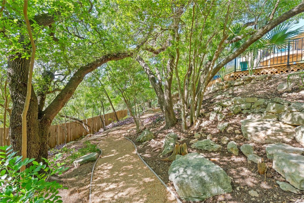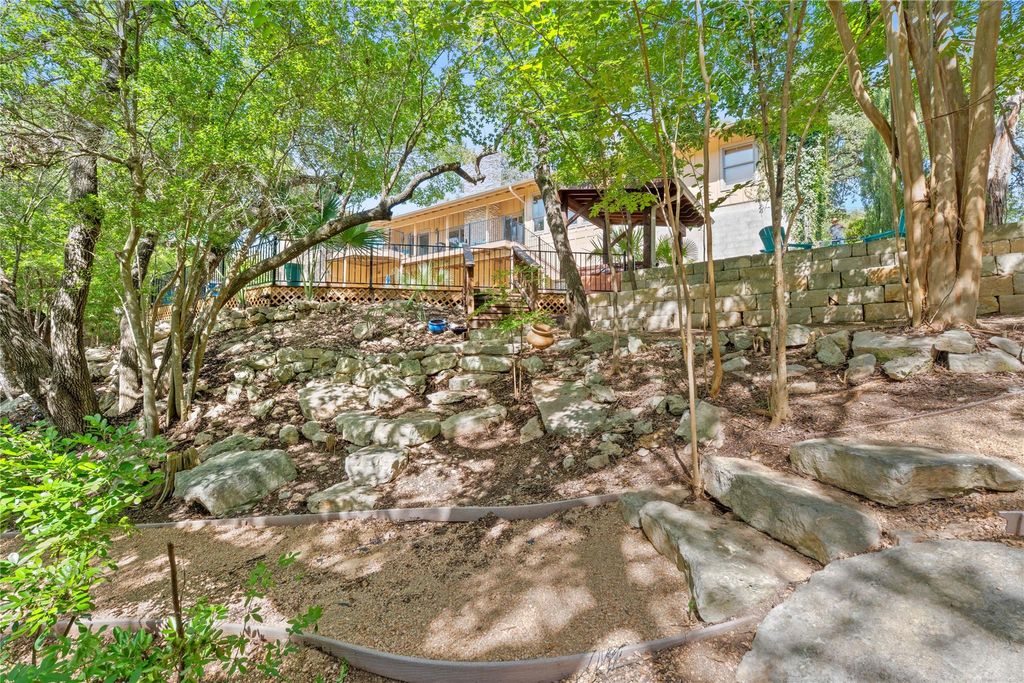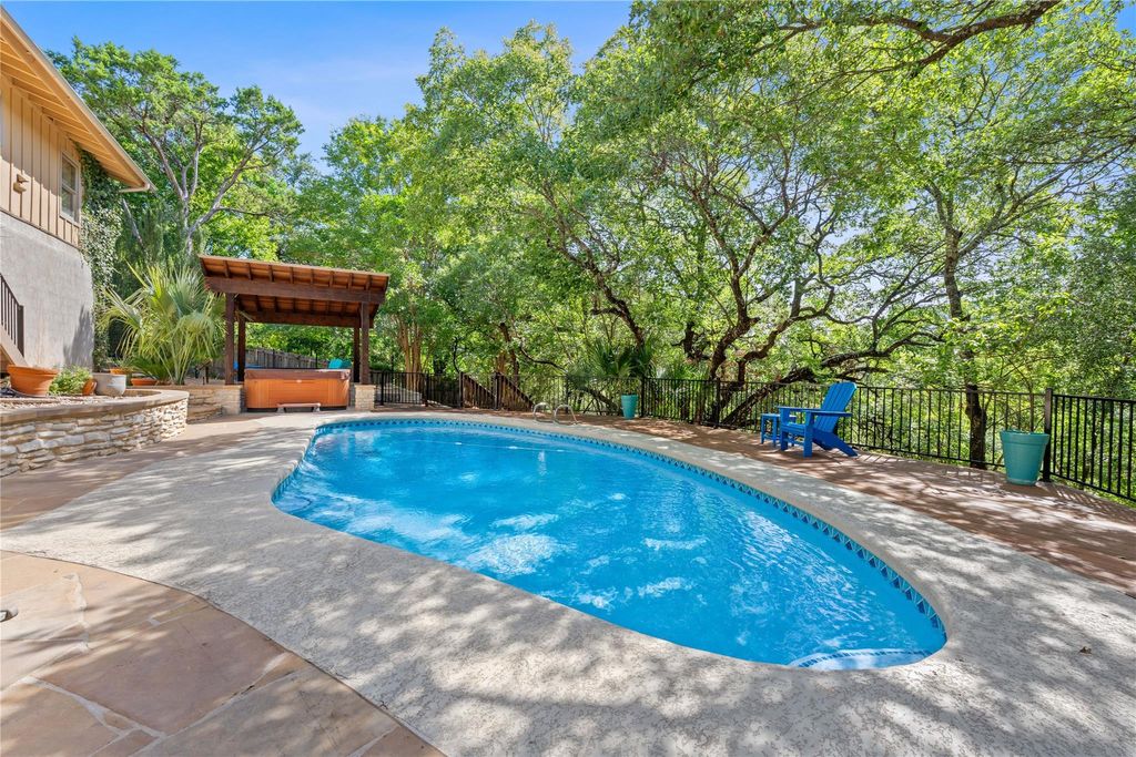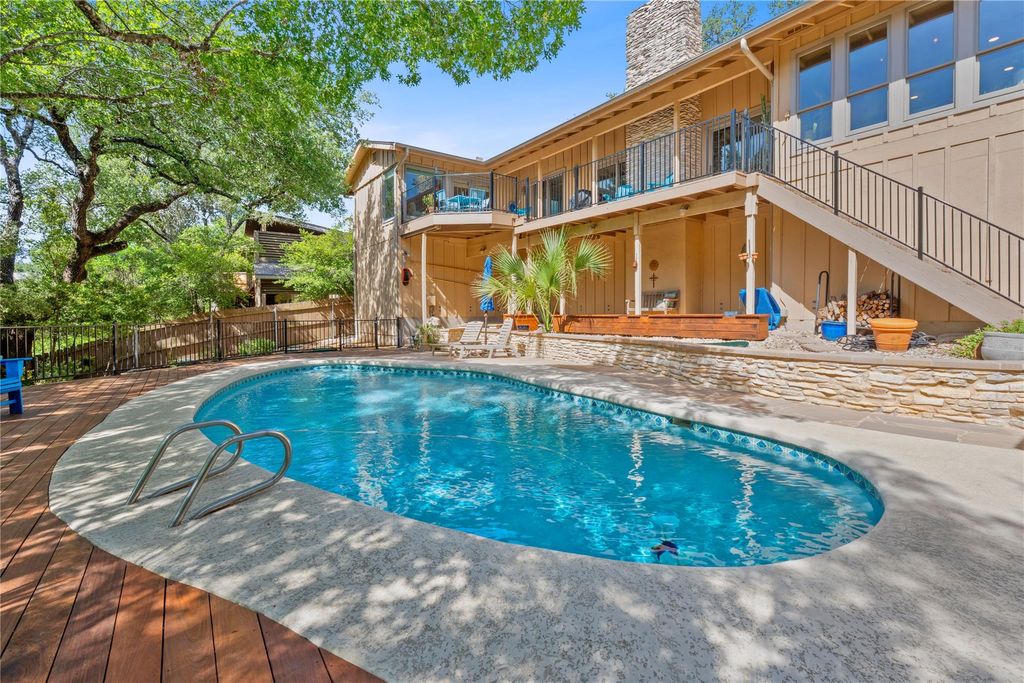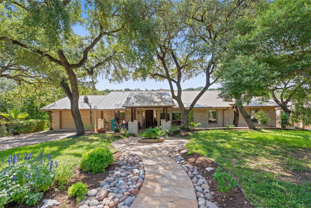 Perched above a quiet, wooded landscape, this single-story home offers treehouse-style living in the heart of Westlake. A stone path leads past mature oaks to a grand front door, opening into a vaulted great room with beamed ceilings, built-in bookcases, and a native Edwards limestone fireplace. Large wood-framed windows"”30 in total"”fill the home with natural light and create a seamless connection between indoors and out. The kitchen is thoughtfully designed with shaker-style cabinetry, black quartz countertops, stainless steel appliances including double ovens, and an oversized island ideal for entertaining. A cozy breakfast nook overlooks the treetops, while a separate dining room sets the stage for intimate gatherings. The flexible floor plan includes a second living area that can function as a game room or media space, plus three spacious secondary bedrooms perfect for guests, home offices, or creative studios. The light-filled primary suite is a serene retreat with private deck access, a walk-in closet, and an en suite bath. Step outside to discover a two-level deck with panoramic views of the lush landscape"”ideal for relaxing or hosting. The lower backyard oasis includes a resort-style pool, Brazilian ipe wood decking, a pergola-covered hot tub area, and native limestone accents. A crushed granite path winds through the shaded yard to a private swing under a grand live oak. Enjoy exceptional privacy with greenbelt space in front and back, just 15 minutes from downtown Austin. This beautifully updated mid-century home delivers a rare blend of architectural character, eco-conscious upgrades, and an elevated lifestyle in one of Austin's most desirable neighborhoods.