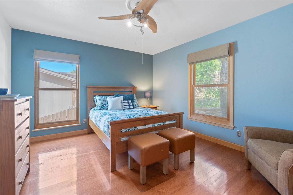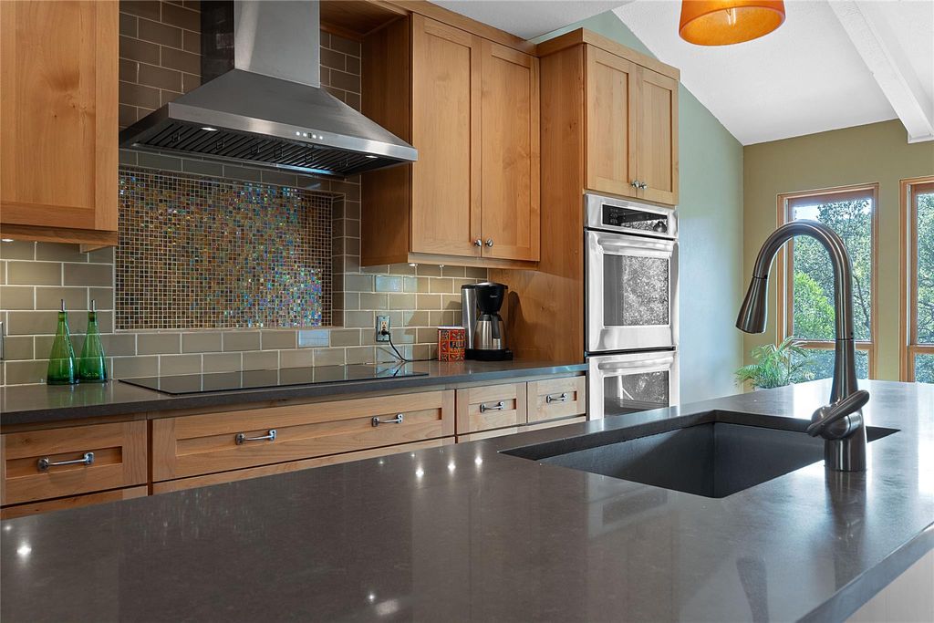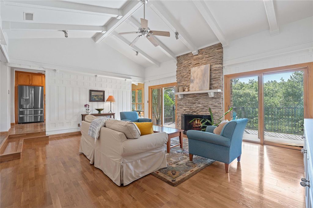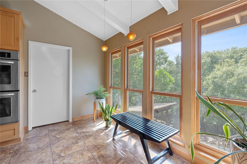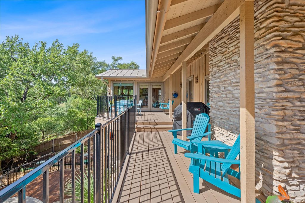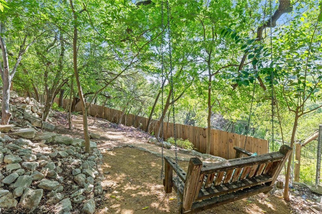 Perched above a quiet, wooded landscape, this single-story home offers treehouse-style living in the heart of Westlake. A stone path leads past mature oaks to a grand front door, opening into a vaulted great room with beamed ceilings, built-in bookcases, and a native Edwards limestone fireplace. Large wood-framed windows"”30 in total"”fill the home with natural light and create a seamless connection between indoors and out. The kitchen is thoughtfully designed with shaker-style cabinetry, black quartz countertops, stainless steel appliances including double ovens, and an oversized island ideal for entertaining. A cozy breakfast nook overlooks the treetops, while a separate dining room sets the stage for intimate gatherings. The flexible floor plan includes a second living area that can function as a game room or media space, plus three spacious secondary bedrooms perfect for guests, home offices, or creative studios. The light-filled primary suite is a serene retreat with private deck access, a walk-in closet, and an en suite bath. Step outside to discover a two-level deck with panoramic views of the lush landscape"”ideal for relaxing or hosting. The lower backyard oasis includes a resort-style pool, Brazilian ipe wood decking, a pergola-covered hot tub area, and native limestone accents. A crushed granite path winds through the shaded yard to a private swing under a grand live oak. Enjoy exceptional privacy with greenbelt space in front and back, just 15 minutes from downtown Austin. This beautifully updated mid-century home delivers a rare blend of architectural character, eco-conscious upgrades, and an elevated lifestyle in one of Austin's most desirable neighborhoods.