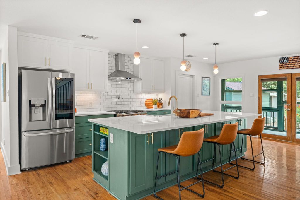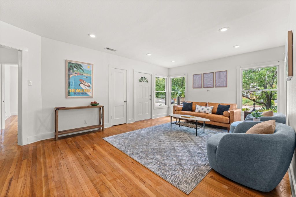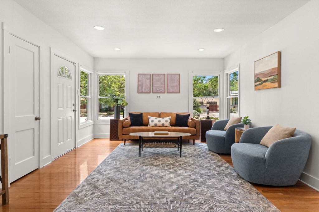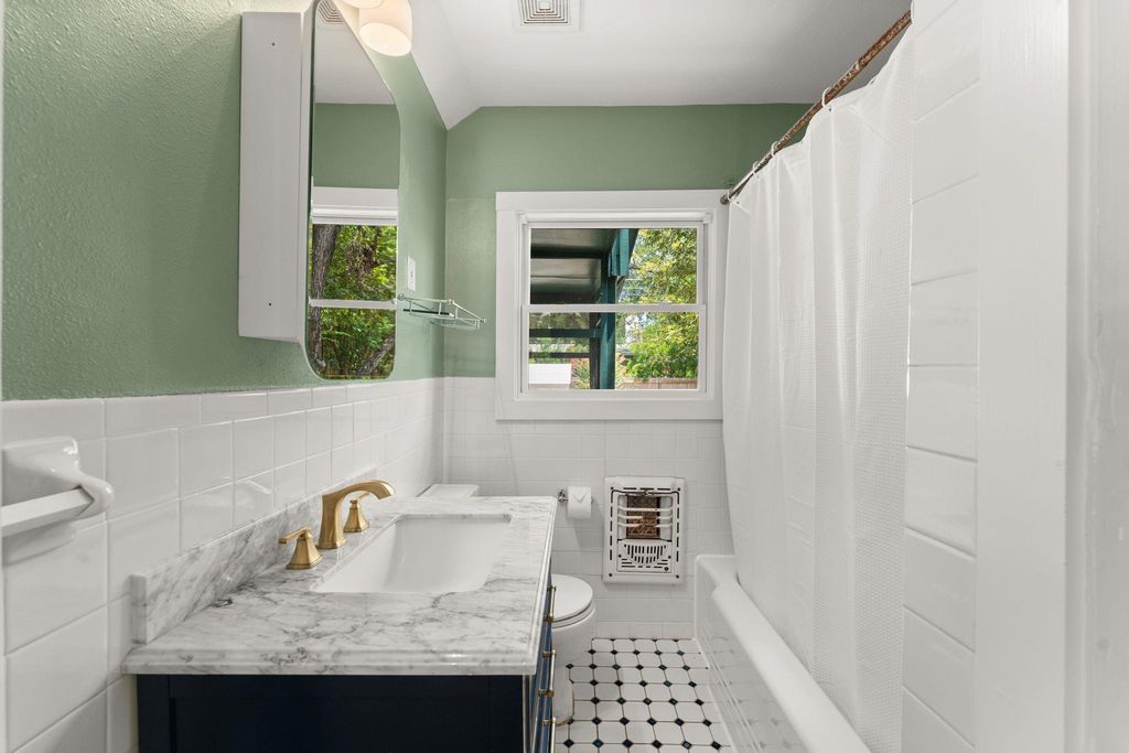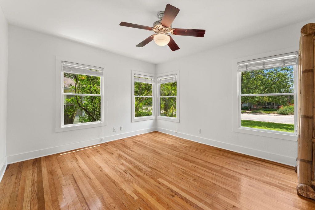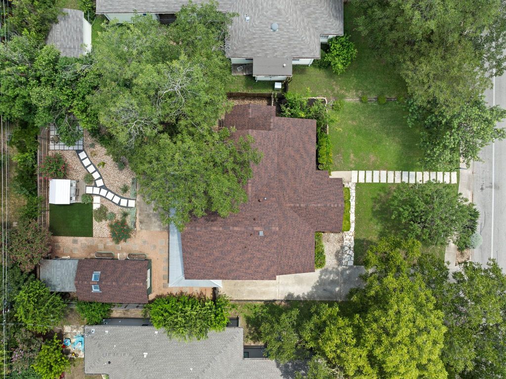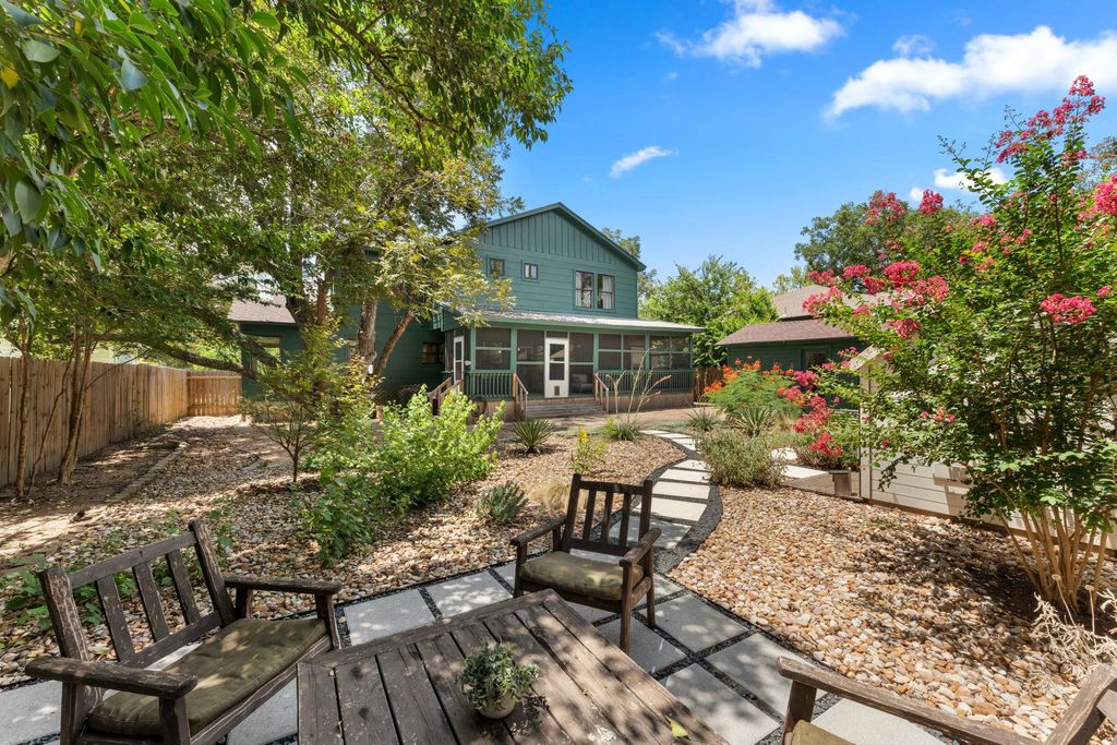 Stunning home on one of Austin's most beloved streets, this beautifully updated home blends original 1940s charm with modern comfort and thoughtful renovations. With 4 bedrooms, 2 bathrooms, and a layout designed for both functionality and style, this property offers inviting spaces both indoors and out. With an open-concept floor plan and high ceilings, the home is filled with natural light, creating a bright and welcoming atmosphere. Original hardwood floors anchor the space, while the layout flows seamlessly throughout the home. Clean lines and fresh finishes enhance its timeless charm while maintaining a modern, airy feel. The chef's kitchen features a large central island, sleek quartz counters, stainless steel appliances, and a stylish mix of cabinetry with brass hardware. The adjacent dining area is framed by windows and modern lighting, creating a warm, inviting space for both casual meals and gatherings. The primary suite on the upper level serves as a private retreat with vaulted ceilings, two large closets, and an ensuite bathroom with dual vanities, frameless shower, soaking tub, updated fixtures, and a clean modern design. An adjoining bonus room offers a versatile space, great for an office, work out room, or whatever suits your needs. Two additional bedrooms are located on the main level, both spacious and bright, showcasing the home's character. The backyard is designed for effortless outdoor living, with a screened-in porch overlooking a private yard filled with mature trees, creating a peaceful retreat. A detached bonus studio with heating/cooling adds even more flexibility, ideal for a home office, art studio, or creative workspace. Easy access to Shoal Creek Trail for running, biking, and walking under shaded mature oaks and pecans. Centrally located, mins from downtown, The Domain, and the Burnet/Anderson corridor, for some of Austin's best restaurants, shops, and entertainment. Top-rated schools.*New Roof July, 2025, New HVAC November, 2024*