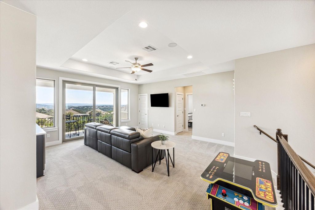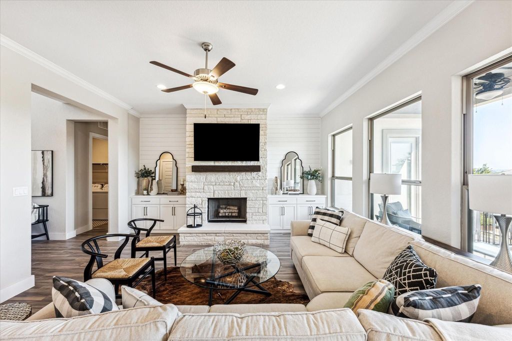 LIKE NEW Stucco & Stone home on premium CULDESAC LOT with NO BACK NEIGHBORS! You'll find beautiful fininshes and a neutral color scheme throughout the 2 story, 4 bed, 3.5 bath home...plus lots of upgrades!! Open Floor Plan. Wood Look Plank Tile. Shutters. Handsome Study w/ glass door & custom built in. Kitchen with quartz countertops, upper cabinets to 10' w/ glass fronts and puck lighting. Large island with farmhouse sink great for entertaining. Upgraded Appliances incl Double Ovens. Wine Fridge. Family room has floor-to-ceiling stone fireplace+cedar mantle and custom cabinets w/ shiplap. Primary BR and luxury en-suite w/ double vanities, free standing tub + separate shower w/ tile accent. Surround Sound in Multiple Rooms. 3 BRs and 2 Full BA upstairs. Patterened Carpet. Gameroom w/ wet bar & beverage fridge. Sliding doors lead to Upper Balcony and amazing views! Garage w/ Epoxy Floor. Covered Back Patio features tongue & groove ceiling + gas stub for future outdoor kitchen. Come See!