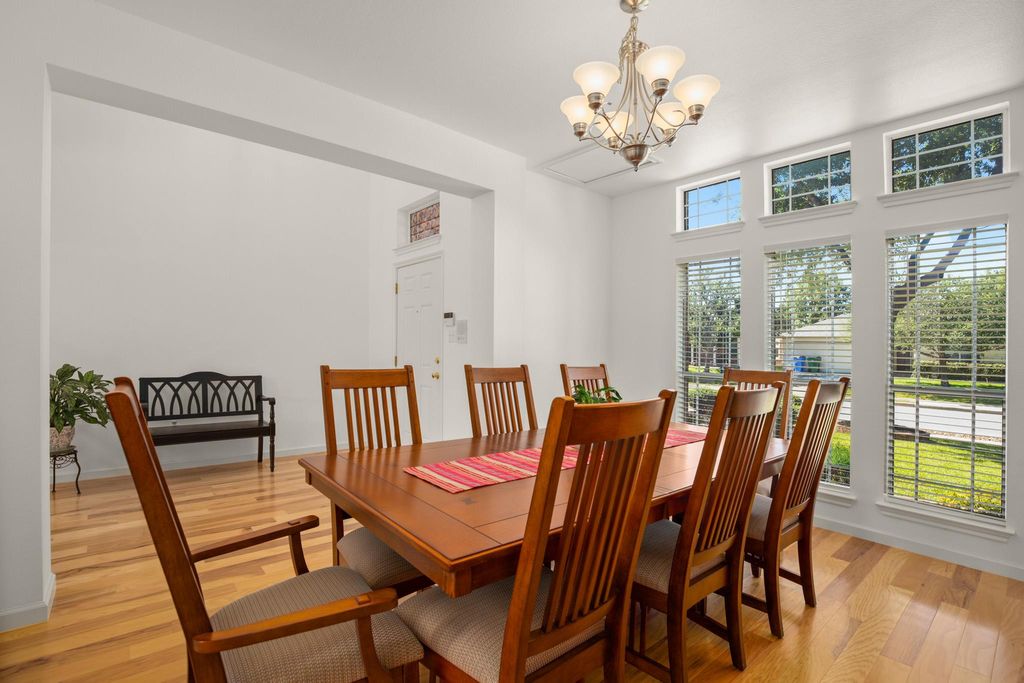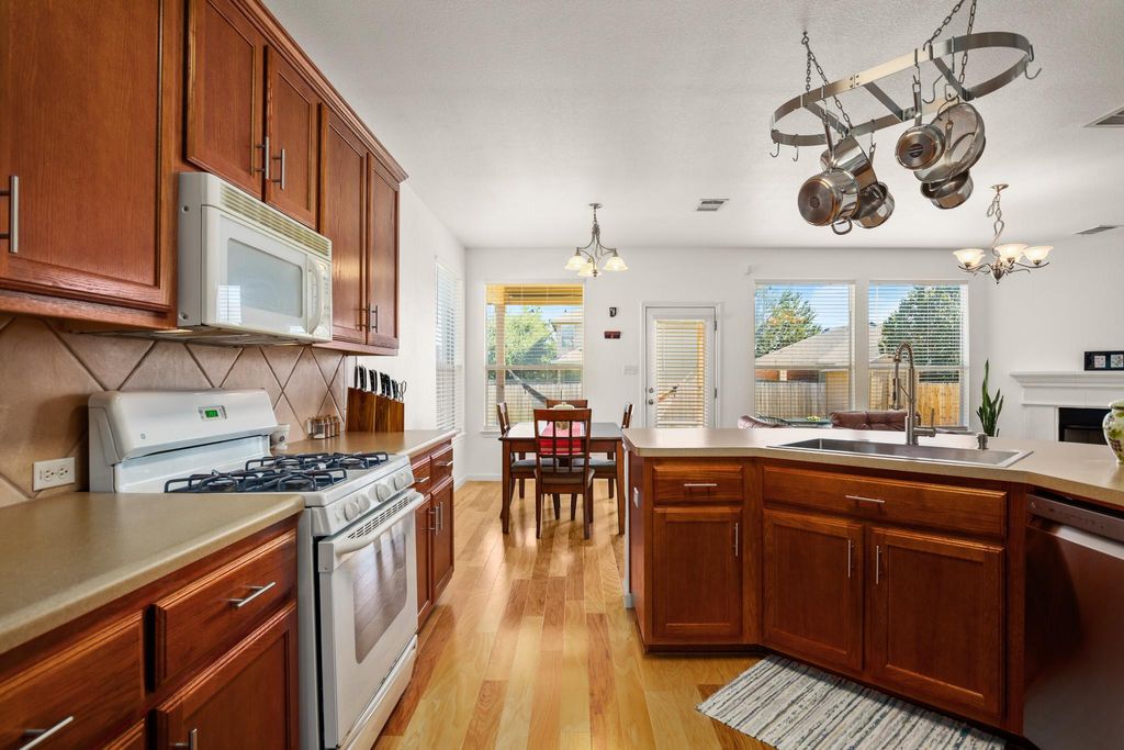 Beautiful Former Model Home on Spacious Corner Lot with Mature Trees! Step into this thoughtfully designed 5-bedroom home featuring a versatile floor plan and laminate flooring throughout"”no carpet! Downstairs offers a private guest suite adjacent to a remodeled full bath with a luxurious rain shower head. Upstairs you'll find the spacious primary suite, three additional bedrooms, two full baths, and a cozy study nook"”perfect for work or homework. Enjoy multiple living options with a formal dining room that can easily serve as a second living space or home office. The inviting gas fireplace adds warmth and charm to the main living area. Situated on a large corner lot, the backyard is a gardener's dream with mature trees, a covered and extended patio, veggie garden, and storage shed that conveys. A partially completed fire pit area offers endless potential"”use it as-is or convert it to garden or flower beds. Additional highlights include an insulated garage door, built-in shelving, water softener, extra storage, and plenty of natural light throughout. Don't miss this unique opportunity to own a former model home with flexibility and function!