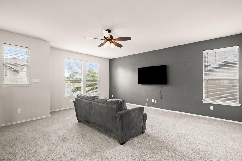 Beautiful two-story Milestone home in the highly desirable Southpark Meadows community of Austin! Situated on the largest lot in the neighborhood and within walking distance to shopping and dining in Southpark Meadows shopping center, this home offers space, style, and convenience. High ceilings and abundant natural light highlight the open layout, with luxury vinyl plank flooring throughout the downstairs living areas and updated fixtures throughout. The kitchen has been tastefully updated and flows seamlessly into the main living space. Upstairs features a secondary living area open to below plus an incredible bonus room closet for extra storage or flex space. Major updates include a roof replaced in December 2025 and a 2022 Carrier zoned with Nest thermostats. Recently serviced HVAC adds peace of mind. A must-see in South Austin! HOA maintains landscaping (mowing of front and back yards, maintaining shrubbery in front yard) and automatic watering of front and back yards.