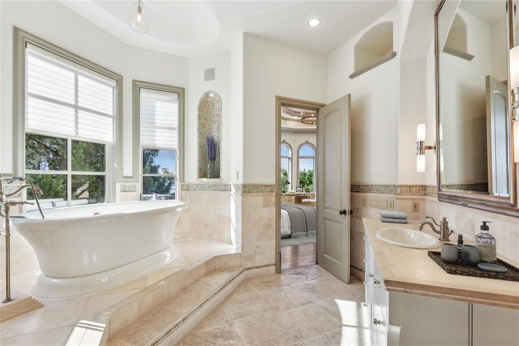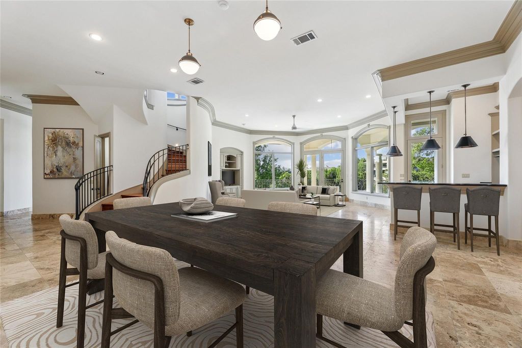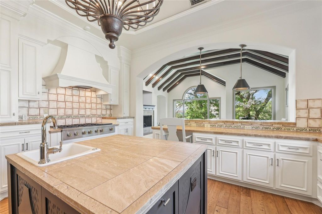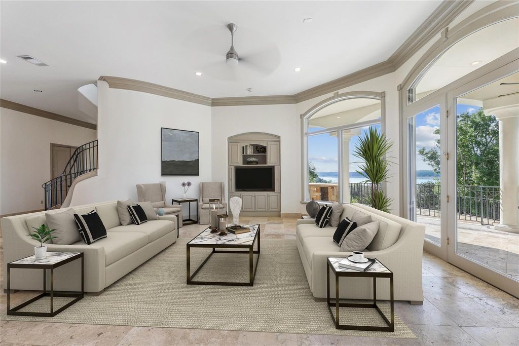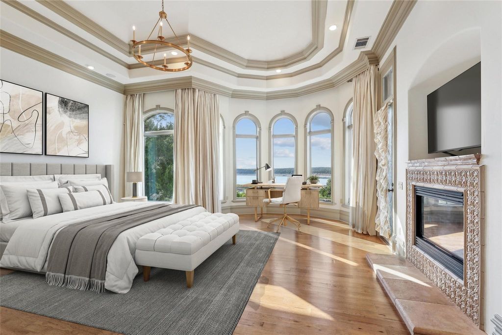 Lakefront Italianate masterpiece with stunning Lake Travis views from almost every window and room in the house. Situated on 1.5 manicured acres within the prestigious gated Vineyard Bay neighborhood. Updated, meticulously cared for and elegantly appointed. "˜Old world craftsmanship' and an absolute commitment to the architectural vernacular. Lavish woodwork begins with the imposing handmade arched double entry doors then woven throughout in the form of custom beams, luxurious crown molding, coved, domed and coffered ceilings... a rich, robust vocabulary that flows from room to room, the warmth of wood subtly juxtaposed against the "˜cool' elements of the hand plastered walls, travertine floors and marble columns. Similarly the forms expressed throughout the home, each room its own elegant expression brought together into a thoughtful symphony of form and material. Coved, barrel vault and domed ceilings, multi-level tray ceilings framed with intricate crown moldings, coffered and beamed, each its own unique, intimate experience yet seamlessly part of the whole. The thoughtful symmetry of architecture, fit and finish extends to it being a true multi-modal lifestyle home, designed to accommodate multi-generational living, entertainment or vacation arrangements. Amenities abound - enjoy an afternoon on the sun soaked pool and pool deck, spend the day on Lake Travis via your private boat slip, hike down the lighted trail through the woods to the waterfront, enjoy prodigious sunsets over the lake from the expansive colonnaded double balcony, gather in the theater room for movie night or with friends and neighbors at the community clubhouse. Completely independent living quarters downstairs with its own living, dining and kitchen, all accessible by elevator. Master suite boasts spectacular lake views and double ensuite bathrooms. Stately home office. Wine room. Thermador appliances. Must-see elegant lakefront lifestyle estate in one of Lakeway's premiere neighborhoods.