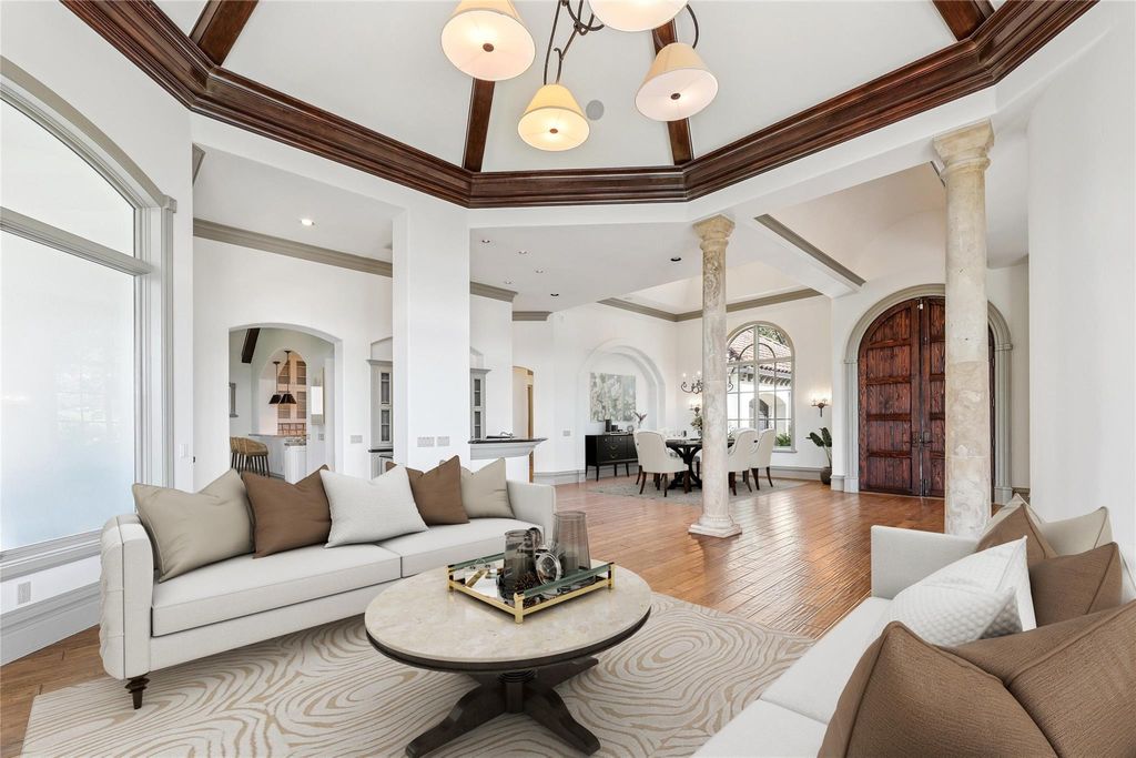 | INTERIOR | Bar, Beamed Ceilings, Bookcases, Breakfast Bar, Built-in Features, Cathedral Ceiling(s), Ceiling Fan(s), Central Vacuum, Chandelier, Coffered Ceiling(s), Crown Molding, Double Vanity, Eat-in Kitchen, Kitchen Island, Master Downstairs, Natural Woodwork, Soaking Tub, Storage, Vaulted Ceiling(s), Walk-In Closet(s), Wet Bar, Wired for Sound |