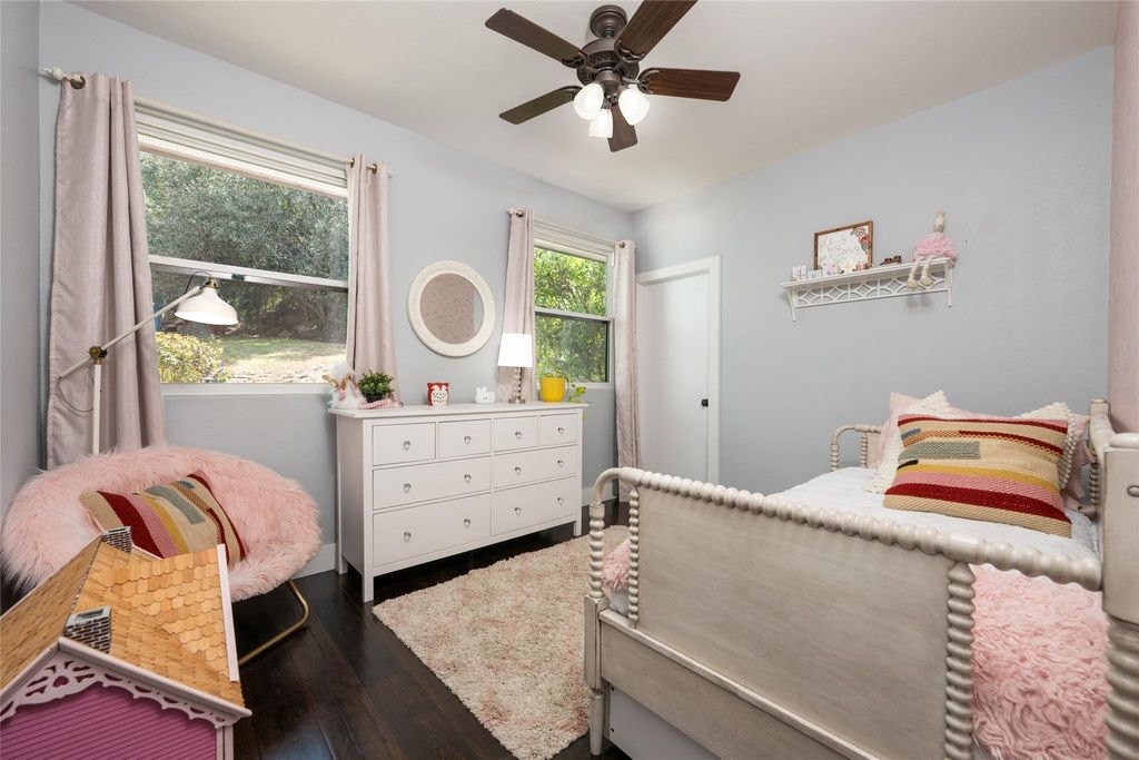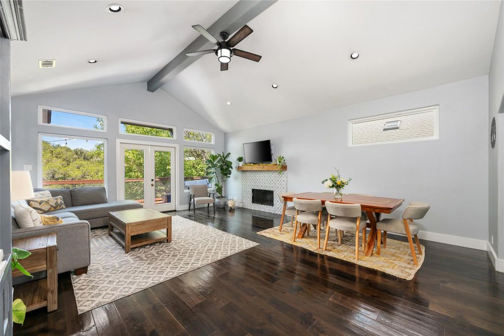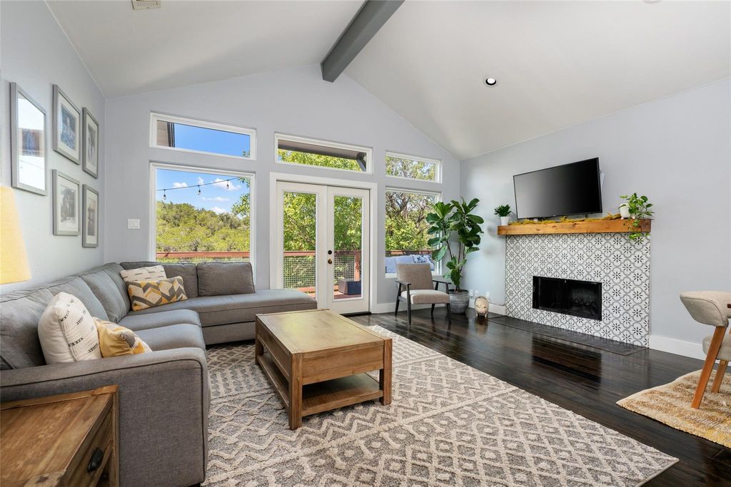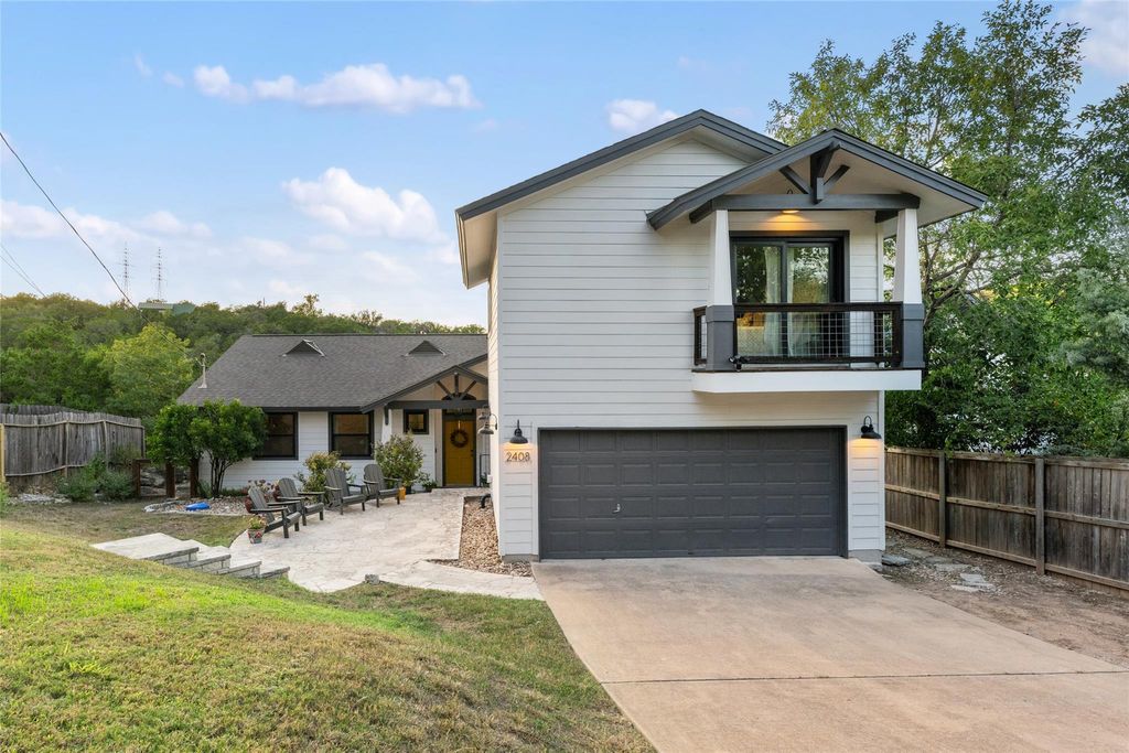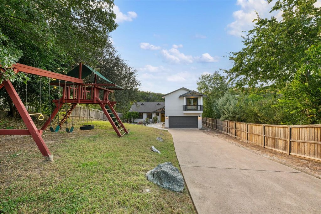 Tucked into the rolling hills of Austin's beloved Apache Shores, this beautifully renovated home blends Hill Country charm with a fresh, modern aesthetic. The main house offers 3 bedrooms, 2 baths, and an open, airy floor plan that draws you in with vaulted, beamed ceilings, abundant natural light, and peaceful greenbelt views. The Carrara marble island anchors a chef-inspired kitchen with quartz countertops and stainless appliances "”a perfect space for gathering. Wide-plank engineered hardwood floors flow throughout the home, creating warmth and continuity. The inviting living room features a tiled fireplace with wood mantle and expansive windows framing the serene hill country beyond. The spacious primary suite feels like a retreat, opening to the back deck where you can unwind under the stars and listen to the night sounds of nature. The spa-inspired bath includes a walk-in shower, soaking tub, and dual vanity. Two additional bedrooms share a full bath. Step outside to a large deck overlooking a canopy of trees and a trail leading to a wet-weather creek that winds through the back of the property"”plus an adorable playhouse tucked beneath the trees for added charm. A separate garage apartment (ADU) offers endless flexibility as a guest suite, private home office, or creative studio. Originally designed as a professional music studio, it includes soundproofing, double drywall, foam insulation, and a silent HVAC system"”a nod to Austin's "Live Music Capital" spirit. With its own entrance, kitchenette, full bath, and living/dining area, it's ideal for extended family or short-term guests. Residents of Apache Shores enjoy an array of amenities: direct Lake Austin access with boat ramp and docks, lakeside picnic areas, pool, basketball & sand volleyball courts, disc golf, hiking trails, and Lake Travis ISD schools. This home truly captures the Hill Country lifestyle"”private, peaceful, and full of character"”yet close to everything the city has to offer.