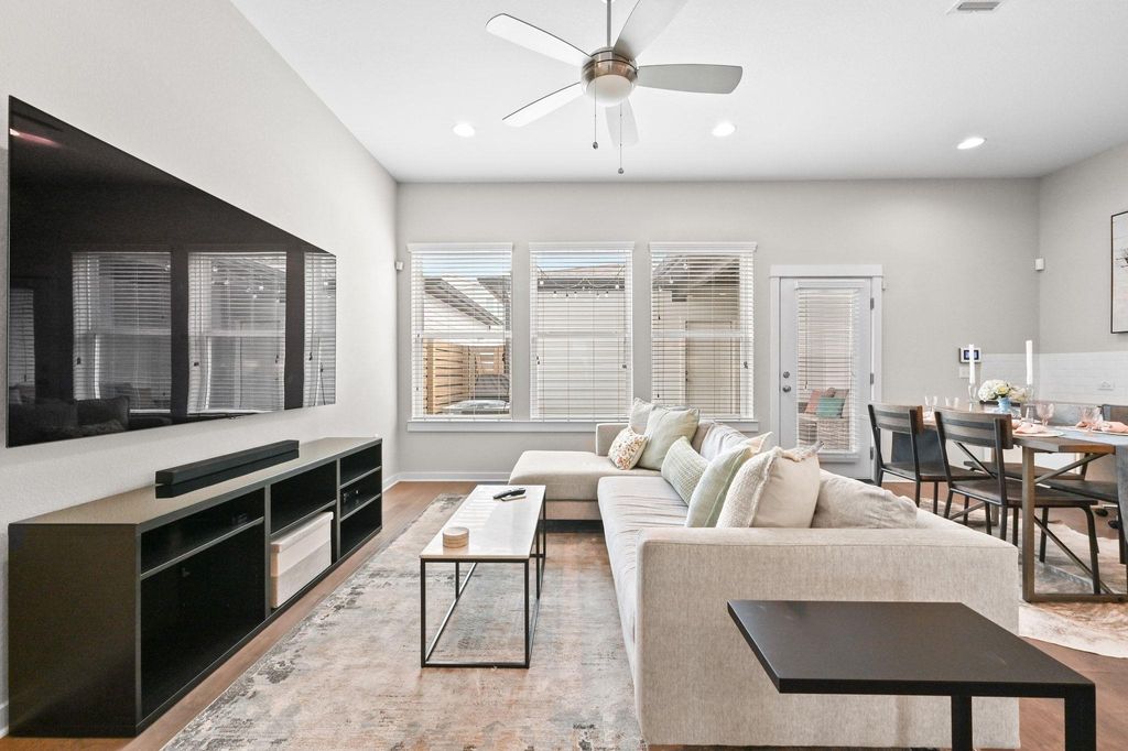 Welcome to 4219 Berkman Dr in the center of the vibrant Mueller Neighborhood! This split level townhouse offers 2 bedrooms with an additional flex space and upstairs balcony retreat overlooking the community. Standout features include an estimated $10,000 addition of custom bookshelves, elegant hardwood floors and stylish kitchen with quartz countertops, stainless steel appliances, & a central island for all to enjoy! This all inclusive property is a refined blend of comfort, style and urban convenience!