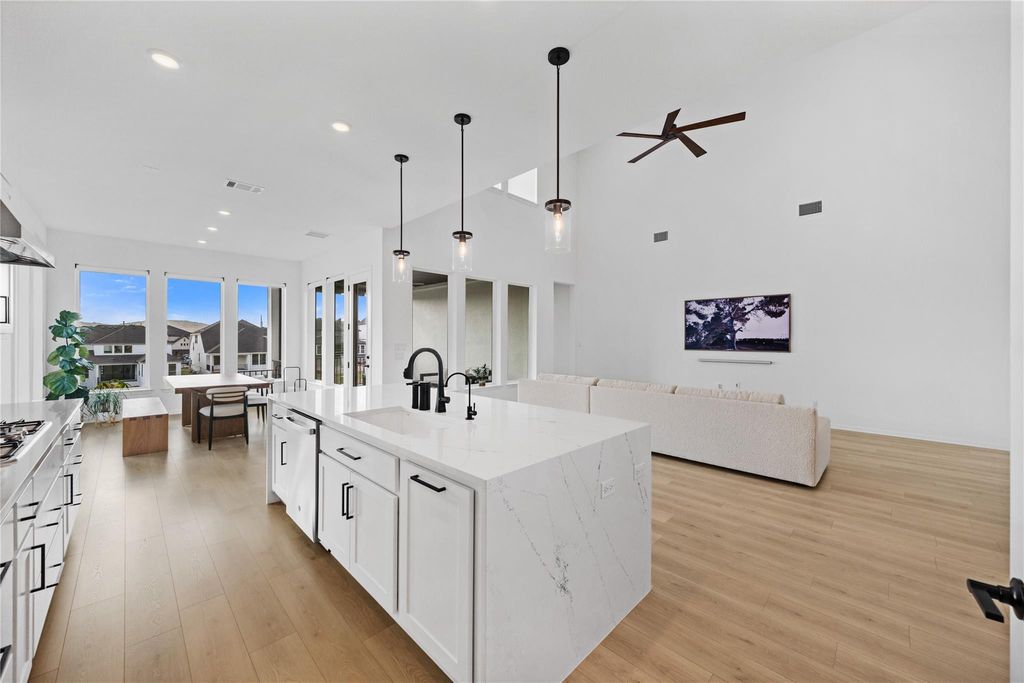 This stunning Taylor Morrison home features the popular Agave floor plan and offers 3,387 square feet of thoughtfully designed living space. Step inside and you'll be greeted by soaring ceilings, an open-concept layout, and an abundance of natural light streaming through large windows that frame the scenic Travisso hills. The gourmet kitchen is the centerpiece of the home, featuring elegant finishes, a spacious island, and seamless flow into the dining and living areas "” perfect for entertaining or family gatherings. The dining room, surrounded by windows on all sides, provides a picturesque setting for meals with a view. Step out onto the covered patio, complete with retractable shades, allowing you to enjoy the outdoors comfortably year-round "” cooler in the summer, warmer in the winter, and always inviting. Upstairs, you'll find generously sized bedrooms, a game room, and flexible spaces ideal for work or play. This home is also just moments away from Travisso's new community center, where you can enjoy sports courts, a resort-style pool, and beautiful hill country trails. Experience luxury, comfort, and the true Travisso lifestyle at 1953 Varese Path "” your hill country retreat awaits.
