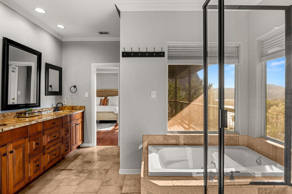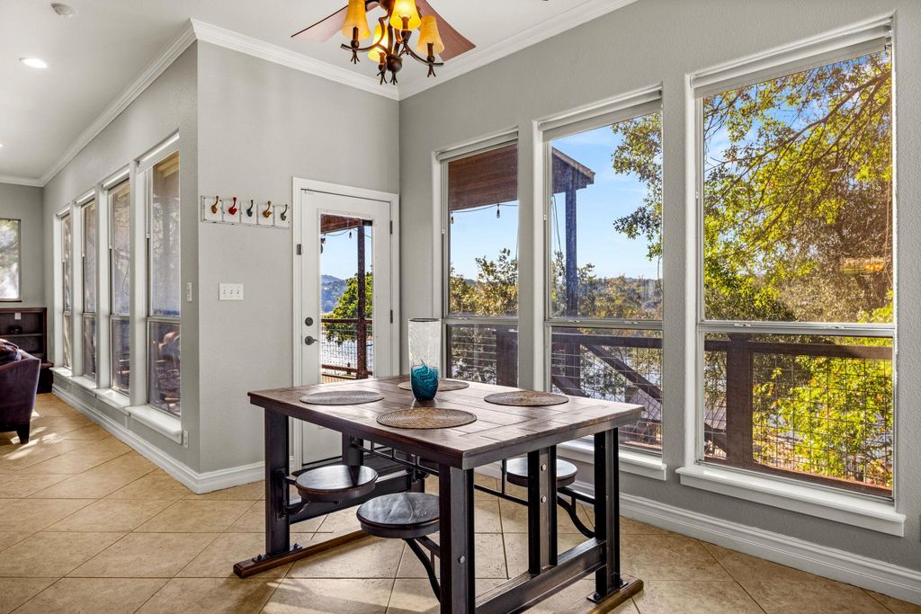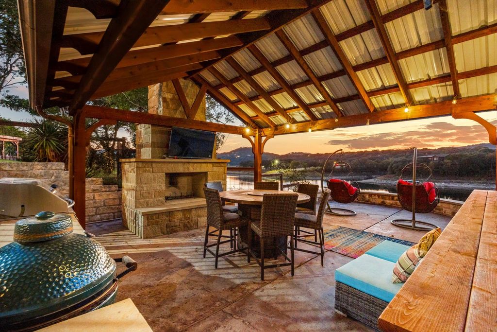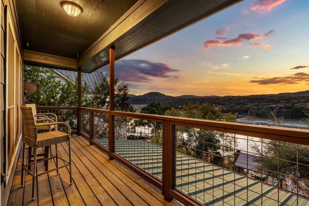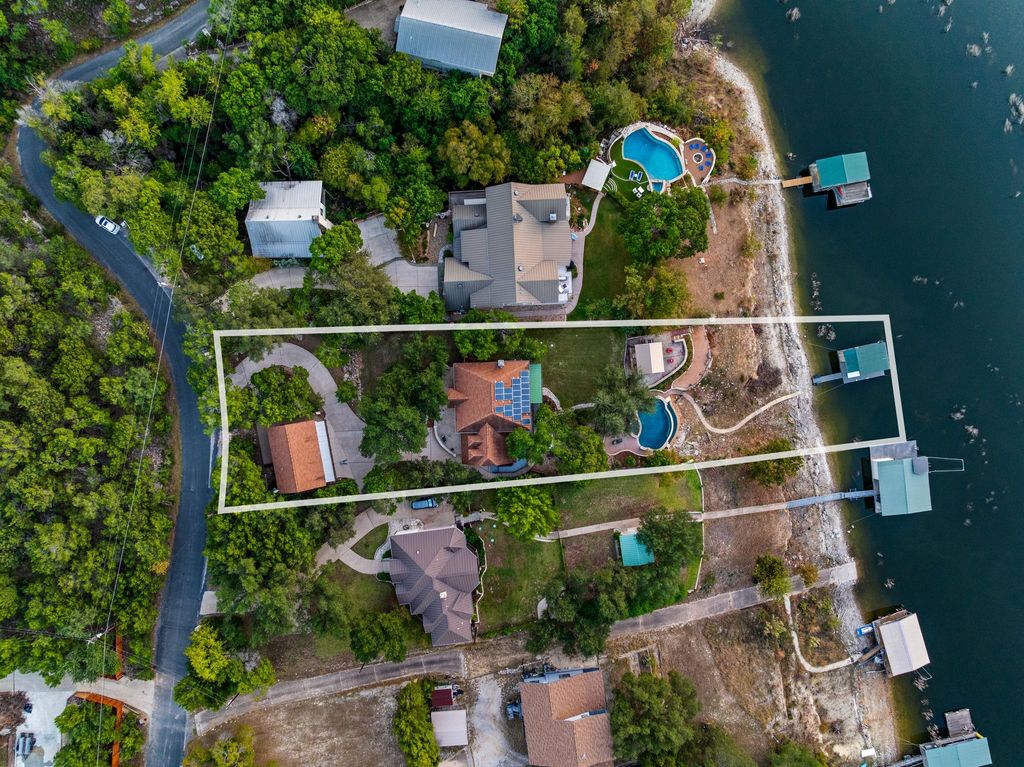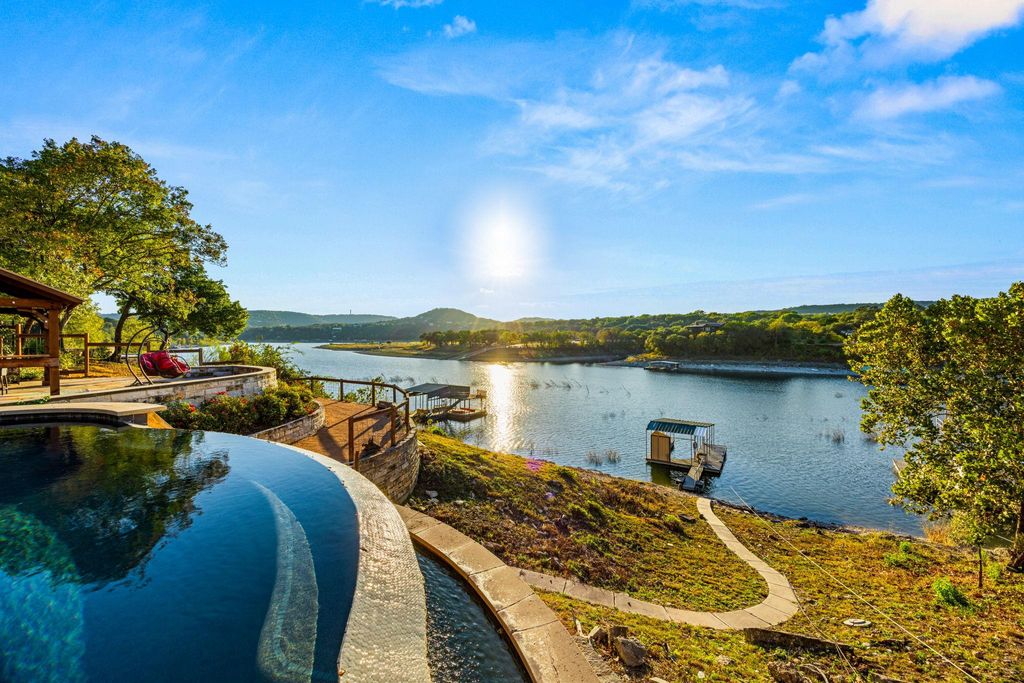 Welcome to your lakefront oasis nestled in the private hills of Lake Travis, where breathtaking Hill Country and water views create a serene, resort-style escape. Whether you're seeking a peaceful personal retreat or a lucrative investment opportunity, this rare property is fully furnished and ready to enjoy or rent from day one. A charming guest house greets you upon arrival, offering warm wood accents and cozy, cabin-like character"”ideal for visitors or home office. The main residence sits further down the drive, showcasing beautiful stonework and timeless curb appeal. Inside, a light-filled layout features a welcoming living room with fireplace and a wall of windows, seamlessly connecting you to the surrounding landscape. The chef's kitchen is designed for entertaining, with stainless steel appliances, a professional-grade refrigerator, and extensive storage. The primary suite is a true sanctuary with private balcony access, a spa-style bath featuring dual vanities, walk-in shower, soaking tub, and a spacious closet. Make your way outside to multi-level decks designed for relaxation and gatherings, complete with shaded lounging areas and an infinity-edge pool and spa that overlook Lake Travis. The outdoor pavilion kitchen is fully equipped with a grill, refrigerator, fireplace, TV, and pull-down shades"”perfect for hosting everything from game day to sunset dinners. A gentle private walkway leads down to your personal boat dock, offering effortless lake access. With solar panels for energy savings, an expansive yard for recreation or future additions, owner financing options, and easy access to Austin, this one-of-a-kind property checks every box.