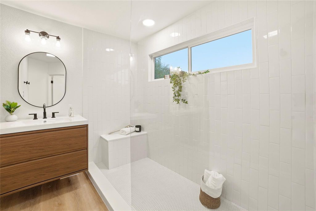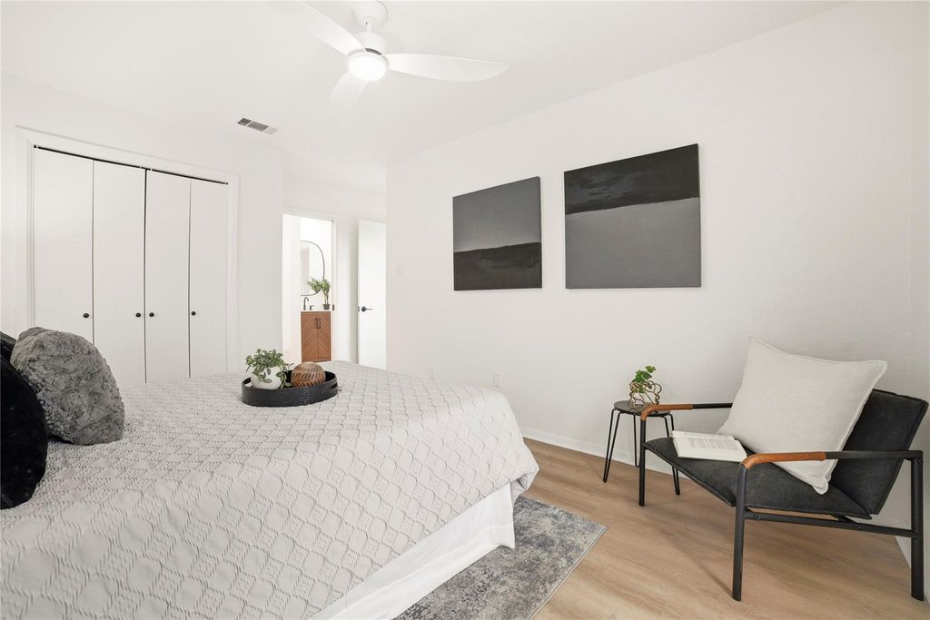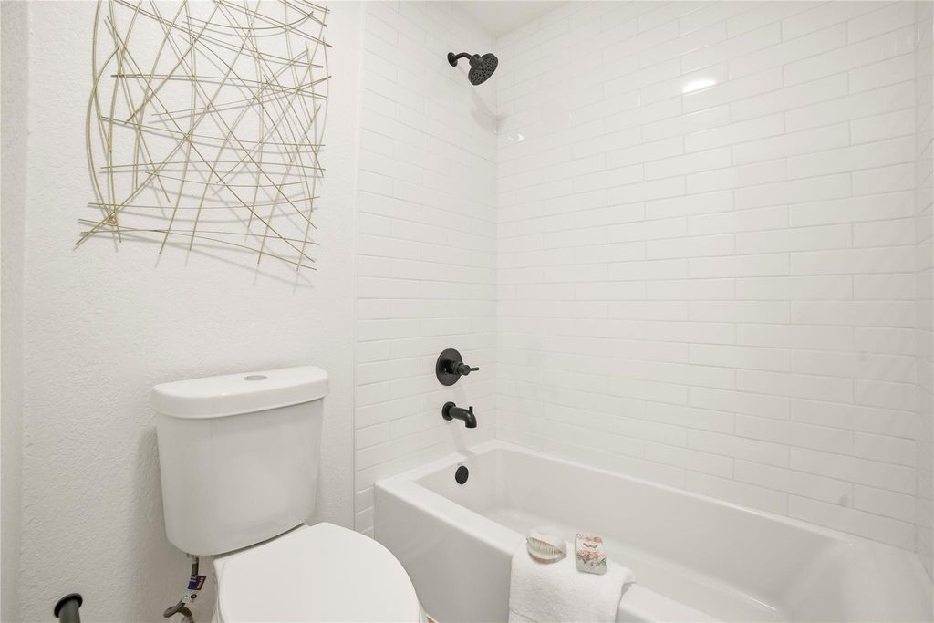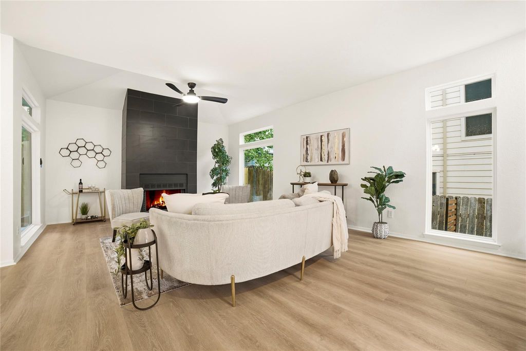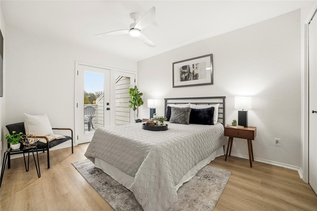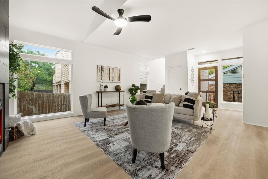 Seller will pay for a 1% buy-down of the loan amount if they use Karen Elliott w Sente Mortgage @ 512.750.2989. Incredible updated condo - the phrase "tres chic" comes to mind, this very stylish 2-bed, 2.5-bath condo in North/central Austin - just off Mopac/Steck/Mesa - offers the perfect blend of comfort, design, and convenience"”10 miles to downtown and 4 miles to The Domain. Inside, an open floor plan is flooded with natural light and elevated by high ceilings, modern lighting, and luxury vinyl plank flooring throughout the main level. The inviting living area features a floor-to-ceiling black tiled fireplace, setting the tone for cozy evenings and contemporary flair. The updated kitchen is a standout with granite countertops, a subway tile backsplash, white shaker cabinetry, and stainless-steel appliances"”including a gas range"”plus a convenient quartz breakfast bar for casual dining. Upstairs, the spacious primary suite boasts a vaulted, beamed ceiling, contemporary window shades, a generous walk-in closet, and a stunning en-suite bath complete with floating dual vanities and an oversized walk-in shower wrapped in modern tile. A well-appointed guest suite includes its own private balcony and en-suite bath with a recent tub, cabinetry, and fixtures. Additional highlights include two fully renovated bathrooms with modern finishes, comfort-height toilets, and a stylish half bath downstairs. The full-size laundry room offers extra storage, and the entire home is outfitted with new modern lighting, ceiling fans, and energy-efficient windows. Enjoy outdoor living on the covered back patio and low-maintenance enclosed yard featuring all new drought-tolerant landscaping(Turf is in the back. The 2-car garage includes epoxy flooring, and, added insulation, Hardie Plank siding, no popcorn ceilings, and a modern front door for added curb appeal. This move-in ready home checks every box.