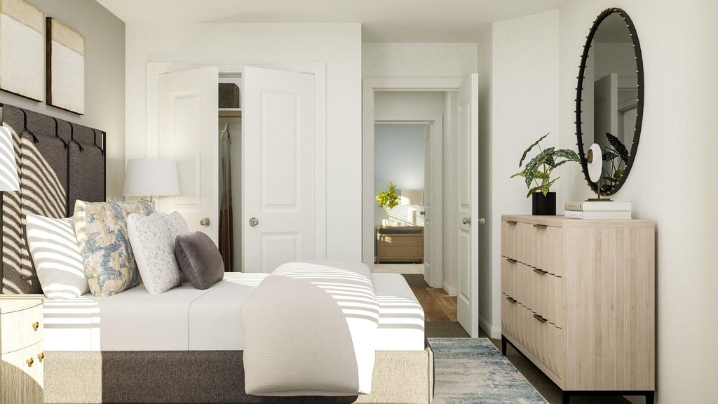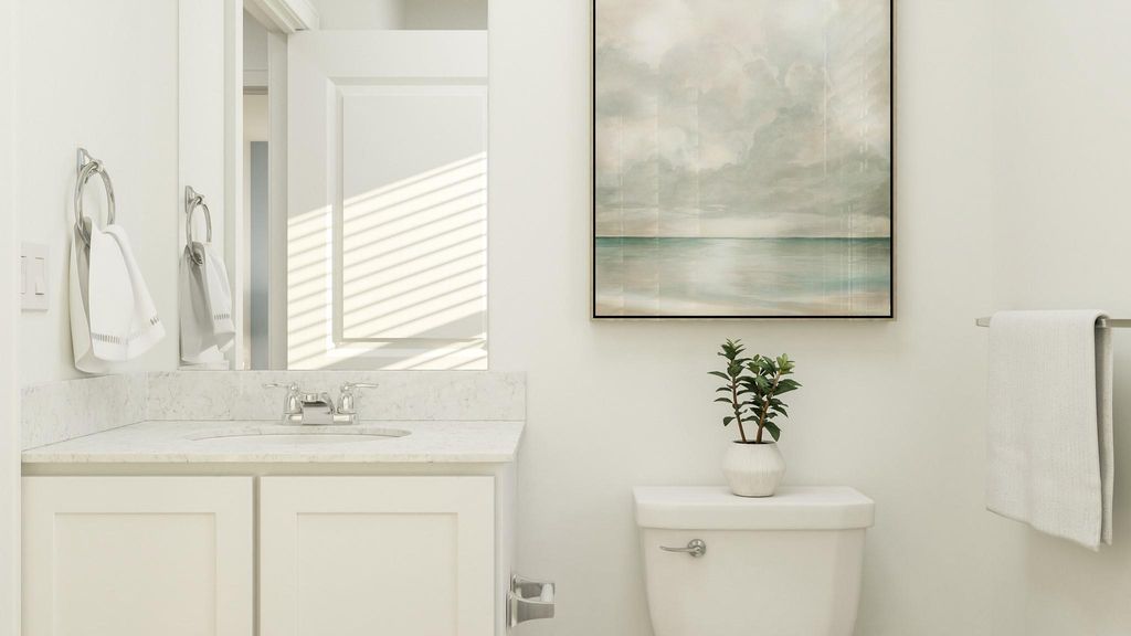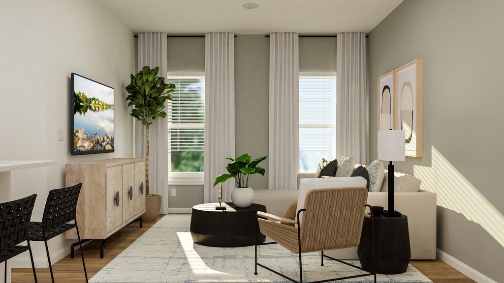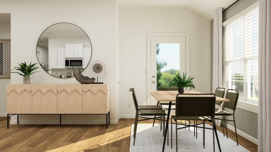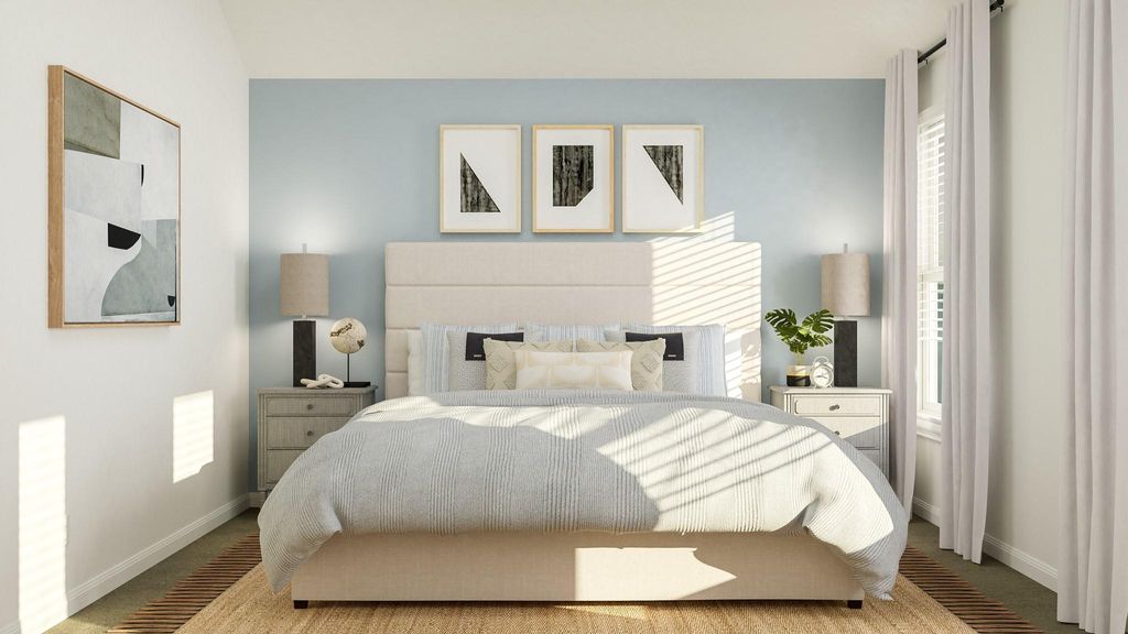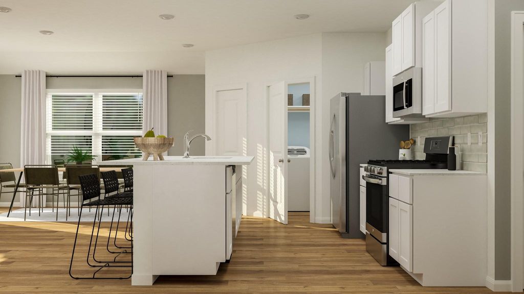 The Albany - This low-maintenance, single-story residence features an open floorplan shared between the family room, dining room and kitchen, situated at the heart of the home. The owner's suite can be found at the back, while two secondary bedrooms are located off the foyer. A covered patio offers seamless indoor-outdoor entertaining. Photos are for illustrative purposes only. Estimated Completion November 2025.