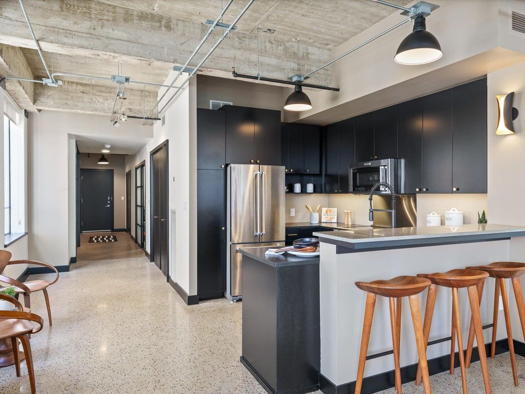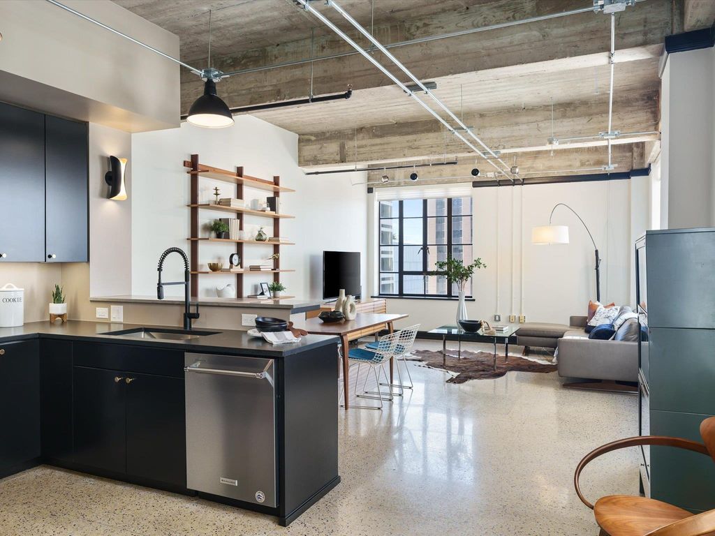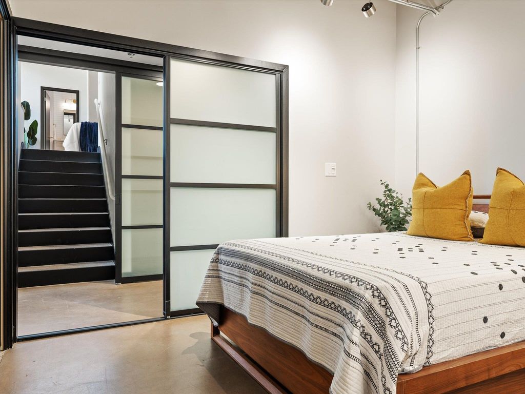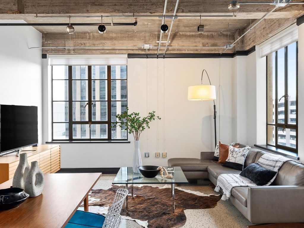 STYLE, SPACE AND SAVINGS! Hot opportunity to secure this coveted Brown Building condo in the heart of Downtown Austin - the first time it has ever been available for resale! Once featured on HG TV, this special unit is a high floor "J" floorplan, the largest of the 10 layouts available, and it features a meticulous and elegant high-end remodel. Save money with the historic tax exemption which provides a discount of around 75% off when combined with homestead, but still ~35% without. The unit features all the modern luxuries with the period features retained. High ceilings with exposed concrete, conduit and ductwork, concrete walls and floors, original 1938 terrazzo flooring in the main level and tile wall and floors in upper bedroom. Light floods the space from 7 huge fully operable window with original brass handles. Kitchen and baths have been remodeled with magazine-worthy high-end fixtures and finishes. Designer lighting has been added in all rooms, and custom sliding doors grace both bedrooms. Upper suite features a walk-in closet, as well as a spa-like walk in shower. HOA Fees include everything but electric and internet. Pet-friendly building! Amenities include new 2025 rooftop deck, fitness center, historic 1938 marble lobby, 3 fast elevators, secure callbox/fob system, garage parking, and a doggie yard/station across the street. Parking space for this unit is one of the best! Everything Downtown Austin is right at your doorstep! Very secure building on quiet corner of downtown 1 block away from, but not in the middle of, all the hustle and bustle. Don't miss out on this rare opportunity to own a large two-bedroom unit in the historic Downtown Brown Building - schedule a showing today!