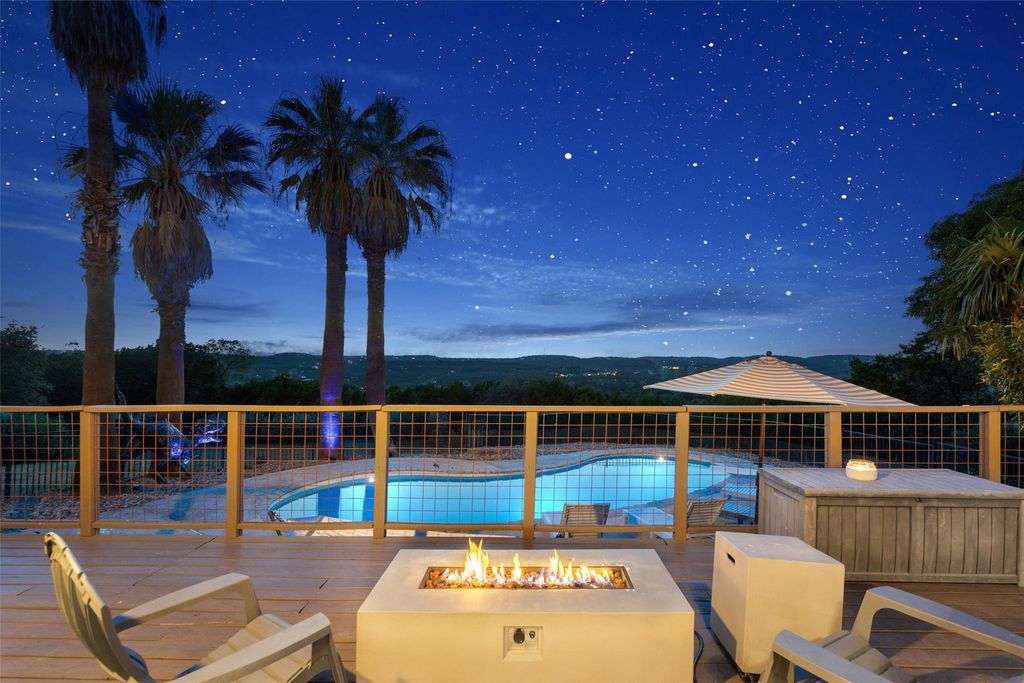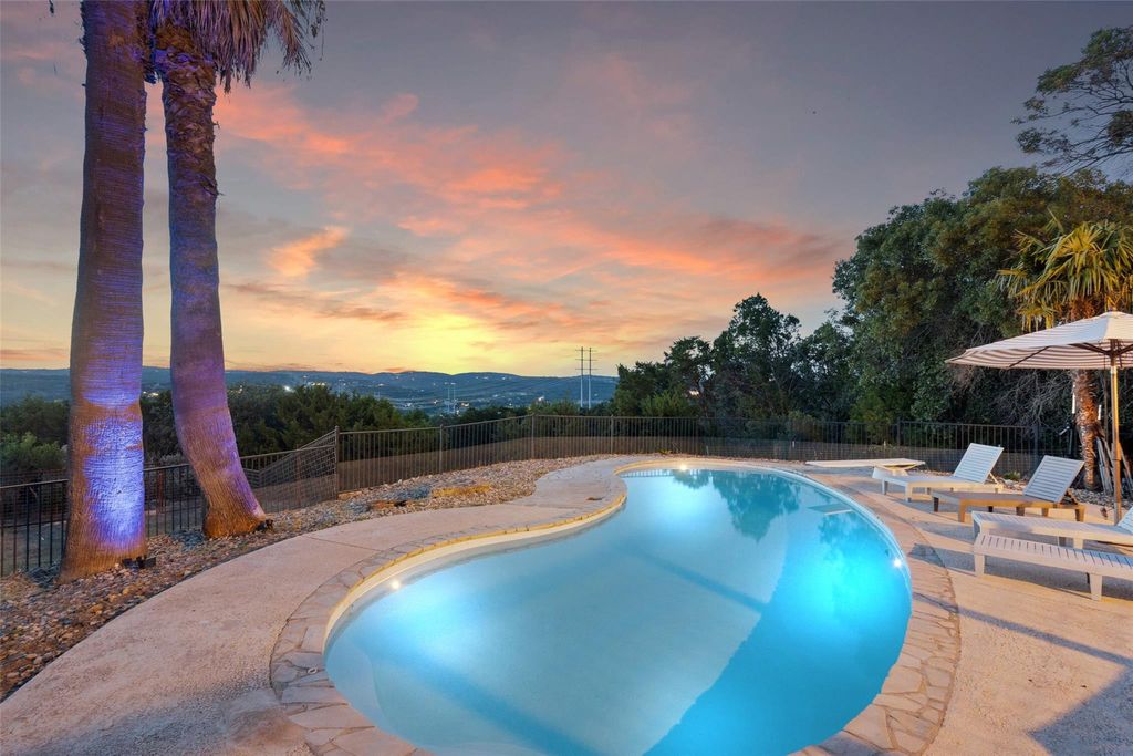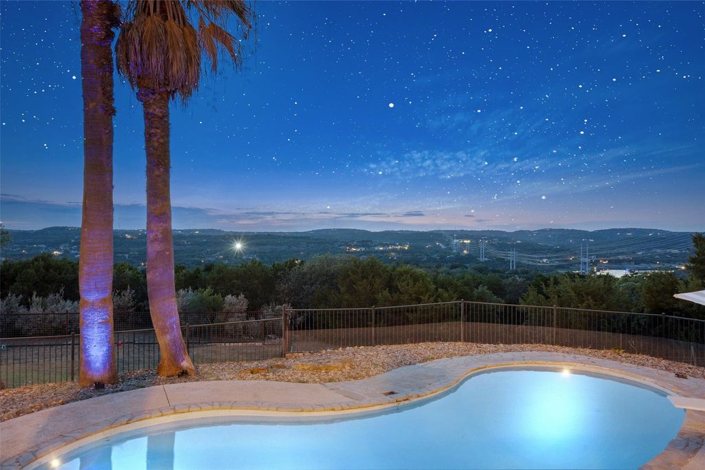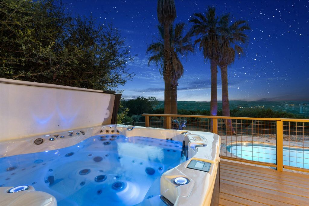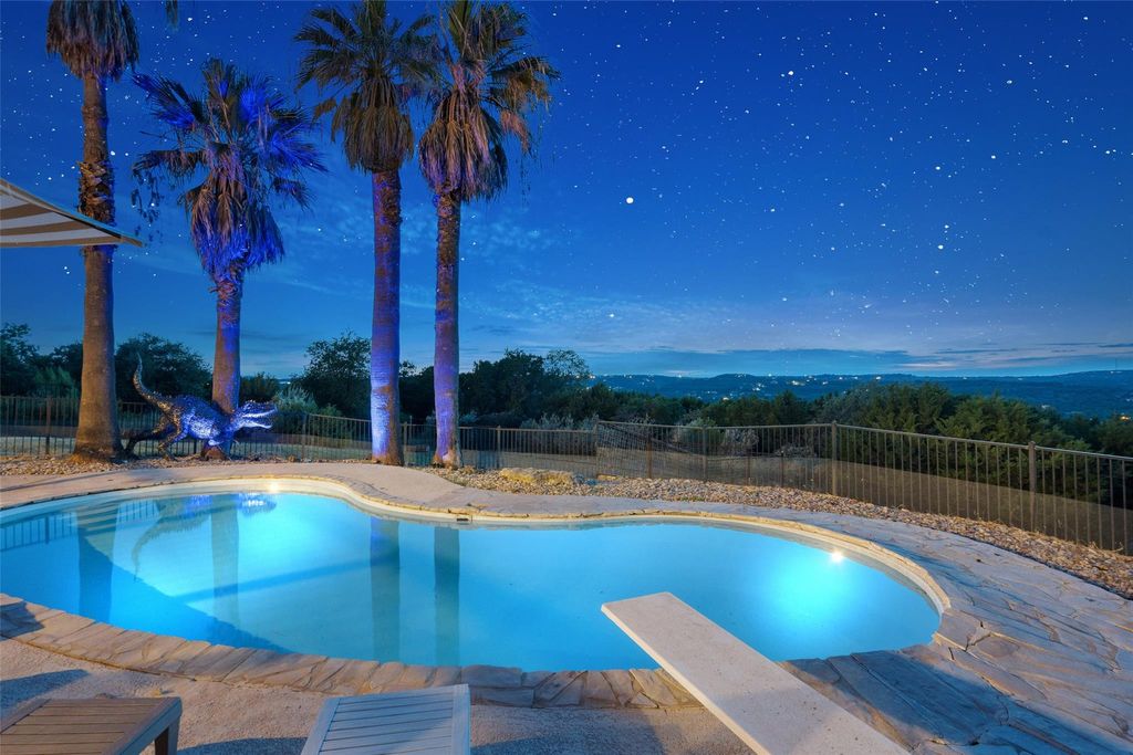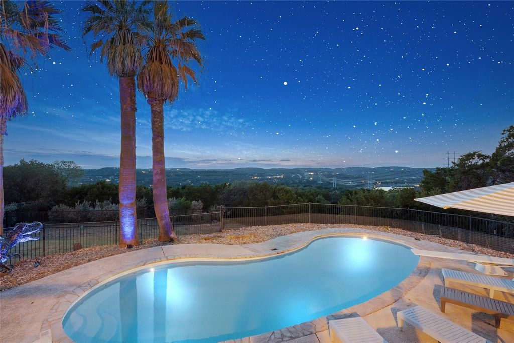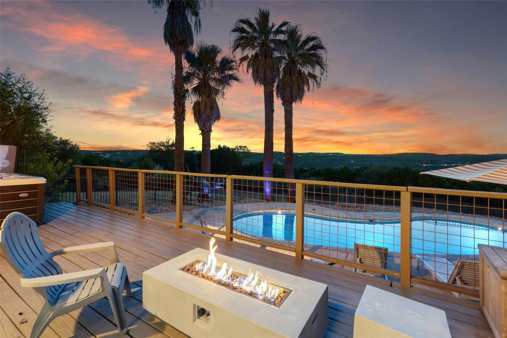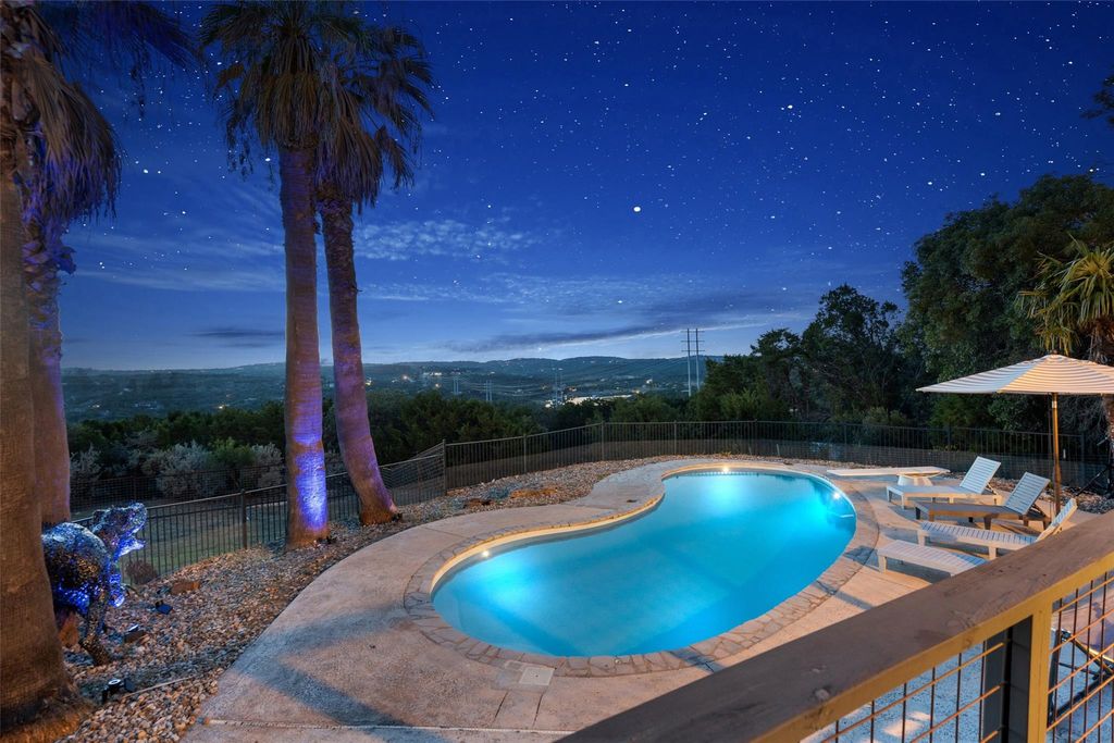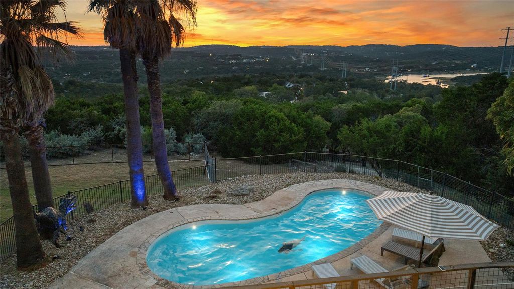 As twilight settles over the Hill Country, the stars emerge above your private hilltop retreat"”one acre of serene elevation in coveted Spicewood, Texas, just moments from Rough Hollow Lakeway, where resort-style living and lakeside luxury blend effortlessly. Here, stargazing by the firepit becomes a nightly ritual and sunrises paint the sky above sweeping treetop views. This 4-bedroom, 3-bath haven offers more than 2,300 square feet of soulful living, with a pool that glows under moonlight and a hot tub poised perfectly for evening soaks beneath the palms. Step inside to discover vaulted ceilings, natural wood beams, and rich European oak floors that carry warmth throughout the thoughtfully updated interior. French doors open to the breeze, blending indoor elegance with outdoor splendor. By day, the poolside terrace is your escape"”whether lounging under striped umbrellas, listening to cicadas from the hammock, or gathering around the fire table as the sun dips low. Indoors, two wood-burning fireplaces offer cozy bookends to your day, and a secondary upstairs lounge invites creativity, connection, or quiet retreat. The finished garage"”complete with heating and AC"”makes an ideal studio, gym, or workshop. The kitchen is outfitted with stainless appliances, granite counters, and crisp white cabinetry, while every space feels both current and character-rich. With a very low tax rate, minimal HOA restrictions, and zoning to highly acclaimed Lake Travis schools, this property balances freedom with investment value. You'll also enjoy private access to a neighborhood boat launch, swim dock, and scenic park"”your gateway to lake days and Hill Country adventure. Come home to something extraordinary"”where every view is a masterpiece, and every day feels like a getaway.