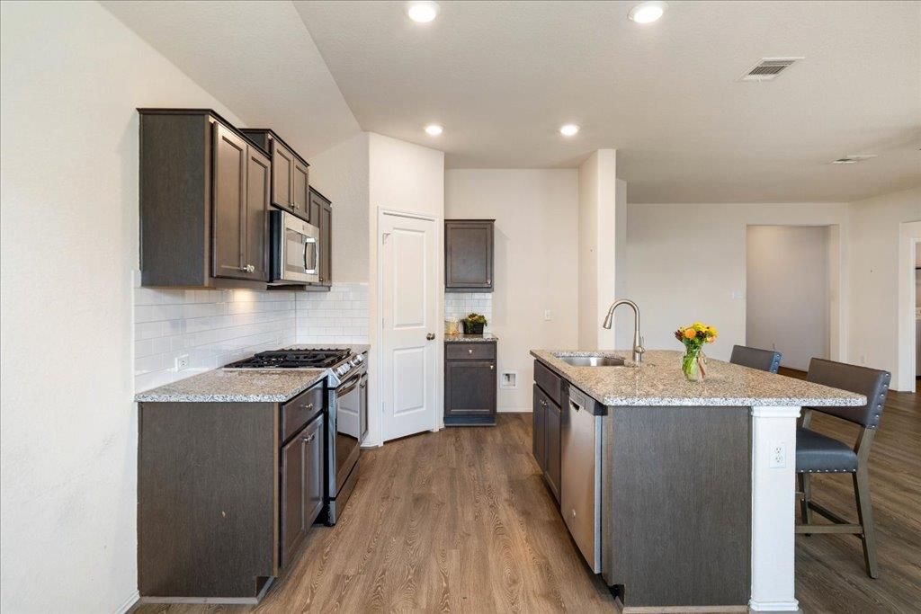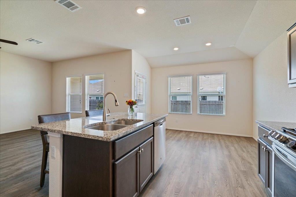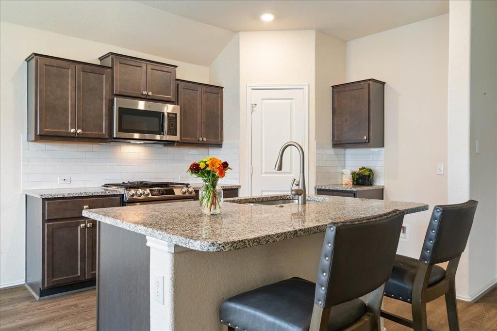 Welcome to 21712 Urraca Ln, a beautifully maintained single-story home tucked away on a quiet cul-de-sac in the highly sought-after Commons at Rowe Lane community in Pflugerville. This 3-bedroom, 2-bathroom home features one of the neighborhood's most popular floor plans, offering a functional and inviting layout that suits a variety of lifestyles. A flexible front room can be used as a formal dining space, home office, or playroom. Durable wood-look vinyl plank flooring extends through the main living areas, while plush carpet provides comfort in the bedrooms. The kitchen is the heart of the home, featuring granite countertops, a large center island with bar seating, subway tile backsplash, stainless steel appliances including a gas range and built-in microwave, and dark cabinetry with abundant storage. The spacious primary suite is privately located at the back of the home, which is a preferred layout, and offers natural light, a dual vanity, glass-enclosed walk-in shower, and a walk-in closet. Two additional bedrooms share a full bath with a tiled tub and shower combo and extended vanity. A separate laundry room with built-in shelving adds convenience. Step outside to a covered patio overlooking a fully fenced backyard, perfect for entertaining, relaxing, or letting pets play. Situated in a peaceful cul-de-sac, the home enjoys added privacy and minimal traffic. Residents of the Commons at Rowe Lane enjoy top-tier amenities including a resort-style pool with splash pad, covered playgrounds, scenic walking trails, a community pond with fountain, picnic areas, and basketball courts. With quick access to TX-130 and close to schools, shopping, and dining, this home blends comfort, lifestyle, and location. Don't miss the chance to own this move-in ready gem in one of Pflugerville's favorite neighborhoods.