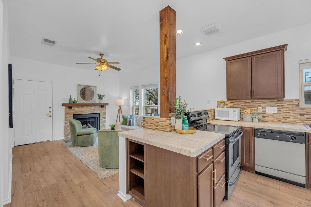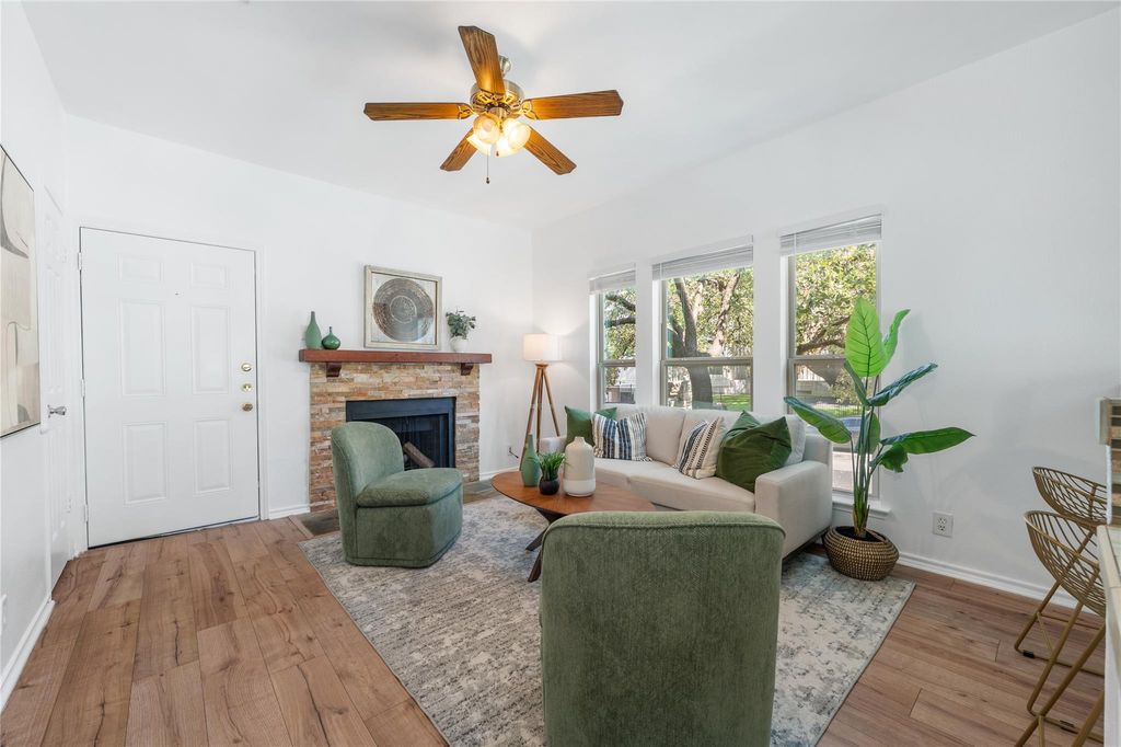 Thoughtfully updated and freshly painted 2 bedroom, 1 bath UT area condo located in the heart of Central Austin/West Campus. Just blocks from Pease Park, Shoal Creek Trail, and the University of Texas, this ground floor unit offers the perfect blend of convenience, comfort, and style. The cozy living room with a fireplace and wood-look laminate flooring plus abundant natural light leads into the adjacent kitchen. Stone countertops and ample cabinet space plus a breakfast bar are perfect for cooking and dining. The bathroom has been stylishly remodeled with modern finishes, including a glass-tiled shower. This unit includes two spacious bedrooms, a stacked washer and dryer, and refrigerator for move in convenience. Outside, enjoy a shaded community courtyard just steps from your front door perfect for relaxing or entertaining. Two dedicated off-street parking spaces are included. Located in the desirable Winchester Condo community, this home offers easy access to downtown, public transportation, and all the dining, shopping, and culture that makes Austin unique! Close to The Drag, UT Campus, the UT Shuttle and lots of dining and more! Quick access to Mopac and minutes to downtown! Perfect for students, investors, or someone who wants to be close to it all whilst living in a peaceful community.