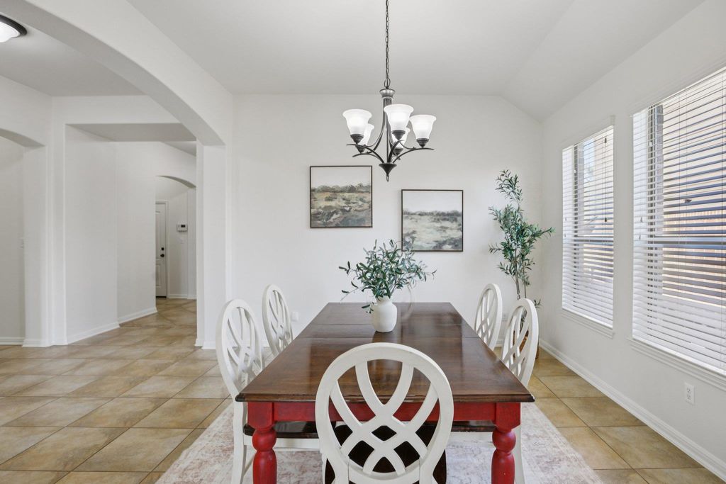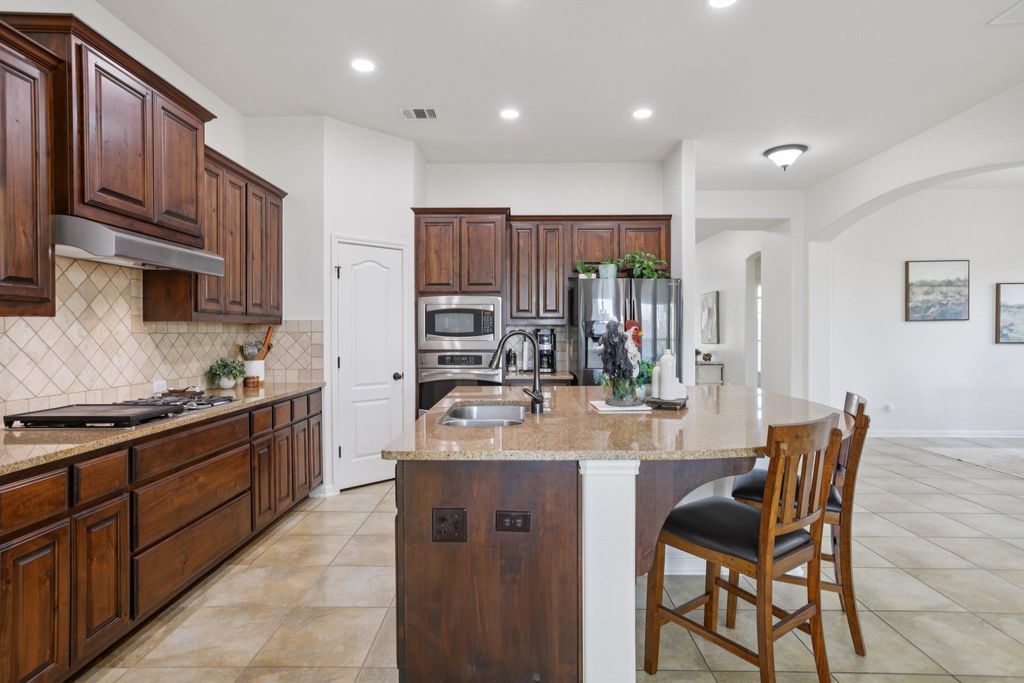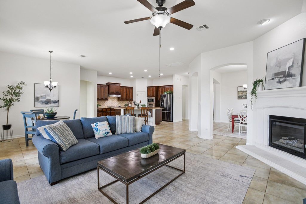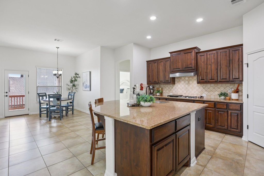 One-story home in Crystal Falls with a functional, open floor plan and fresh interior updates. The home offers 4 bedrooms, 3 full baths, and a large central living, dining, and kitchen space designed for everyday use and entertaining. The kitchen includes granite countertops, an oversized island with seating. Breakfast dining, formal dining, and island seating all flow within the open layout. Flooring throughout the home is a mix of tile and carpet. Interior paint and carpet have been recently updated. The primary bedroom suite features separate vanities, a soaking tub, a separate shower, and a large walk-in closet. Secondary bedrooms are well positioned, offering flexibility for guests, office space, or additional living needs. A three-car garage provides extra storage and parking. The backyard includes an elevated deck overlooking part of the neighborhood, with stairs leading down to a private stone firepit area with built-in curved bench seating. Crystal Falls residents enjoy access to two pools, a splash pad, tennis courts, a catch-and-release pond, frisbee golf, trails throughout the community, and an 18-hole golf course with a pro shop, restaurant, and driving range. A full-time activities director hosts events year-round, supporting an active and connected neighborhood.