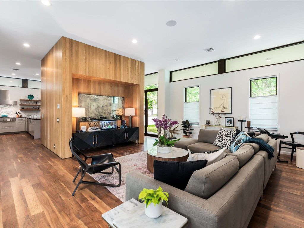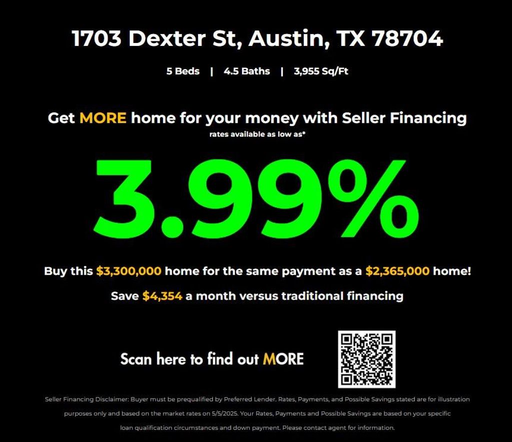 Buy this $3,300,000 home for the same payment as a $2,365,000 home! MAXIMIZE YOUR BUYING POWER with exclusive seller financing! Well qualified buyers can lock in rates from the mid-4's to mid-5's, depending on down payment, and save up to $105K in closing costs. Minimum 30% down payment. All buyers must be pre-approved through Preferred Lender to be considered. No formal underwriting, no discount points, close in as little as 14 days. House and Detached Apartment!! This stunning midcentury modern custom-designed home by the renowned architect Stuart Sampley was featured on the 2014 AIA Austin Tour and has been rated 5 stars by Austin Green Building. Boasting 5 bedrooms and 4.5 bathrooms across 3955 square feet, this home sits on a spacious .29-acre double lot. Upon entering, you'll be greeted by the expansive main living areas adorned with clerestory windows and high ceilings, complemented by elegant walnut floors. The kitchen is a true masterpiece, featuring a large island with quartz counters, marble backsplash, Jennair appliances, and an under-counter refrigerator. 1. The primary bedroom, located on the main level, offers a wall of built-in closets and an attached studio/study. The primary bathroom was updated in with 2022 with new tile, fixtures, and mirrors. There is another living area downstairs serving as a den or family room. A guest suite with an ensuite bathroom and its own entrance is also conveniently situated downstairs. Upstairs, two bedrooms and another study provide ample space for relaxation and work or play. The backyard oasis beckons with a large covered patio, outdoor sink and bar, a gas firepit, and expansive grassy area, perfect for a future pool. A detached 2-car garage with a studio apartment above, which has served as a short-term rental, completes this remarkable property. Don't miss the opportunity to own this exceptional home in a prime Austin location. See the virtual tour for more photos and a 360 tour.
