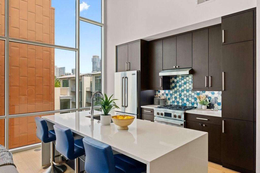 Experience Austin from a vantage point few ever experience, perched high above the city in a penthouse unit at Barton Place Condominiums. Located just across the river from downtown and steps from Barton Springs, Zilker Park, and the Town Lake Hike & Bike Trail, this residence blends the energy of city living with the serenity of Austin's most beloved green spaces. This single-level, two-bedroom, two-bath home with convenient storage closet in the parking garage is designed for both style and comfort. Soaring ceilings, warm wood floors, and oversized windows frame sweeping views of the river, Hill Country, and Zilker Park. The open main living space connects seamlessly to a sleek kitchen anchored by an oversized center island with waterfall edge, quartz countertops, Jenn-Air stainless steel appliances, including a gas range, that extends to the living room and out to a private balcony, where the views are simply unforgettable. The primary suite is a private retreat with dramatic ceilings, a luxury ensuite bath, and its own balcony for quiet mornings or starlit evenings. A second bedroom, conveniently located near the guest bath, is ideal for visitors or a dedicated home office. Barton Place offers a host of resort-style amenities: a heated saltwater pool with lounge and BBQ area, four rooftop terraces with grills, a community garden, a fitness center, dog park, Owner's lounge with kitchenette, and a rentable guest suite for overnight visitors. This secure, gated community includes 24-hour concierge service, two reserved parking spaces, and a private storage closet is conveniently located directly behind the parking spaces. From sunrise runs along the lake to evenings on "Restaurant Row," this penthouse is perfectly placed to enjoy everything Austin has to offer, nature, nightlife, and the unique character of the city you love, all right at your doorstep. Buyer to verify all info.