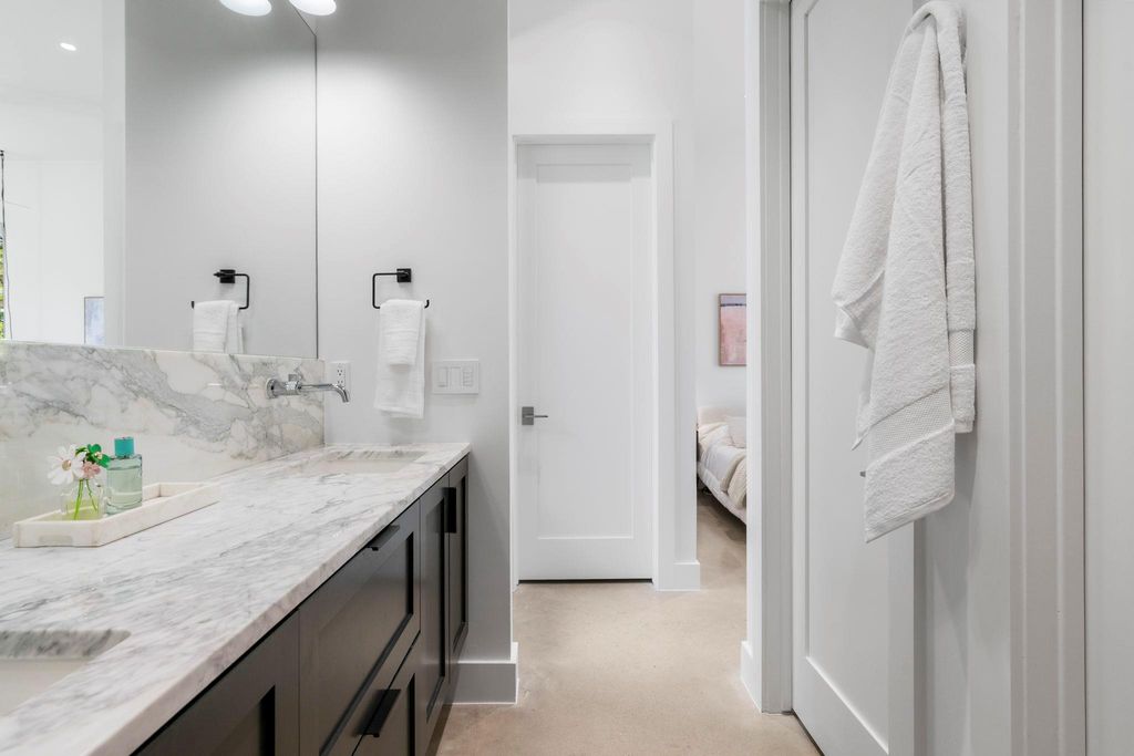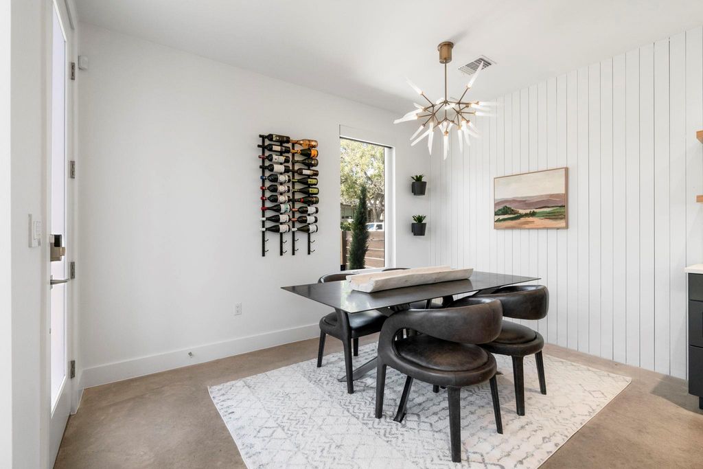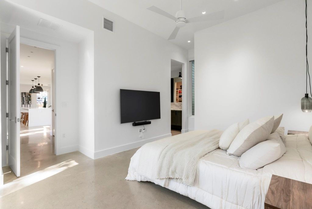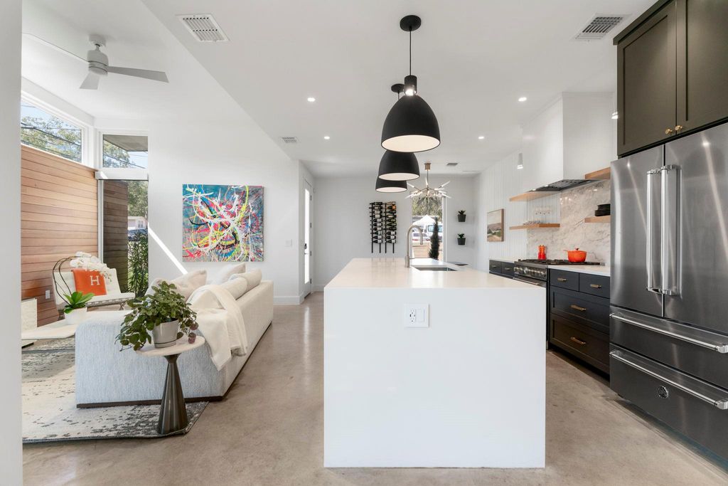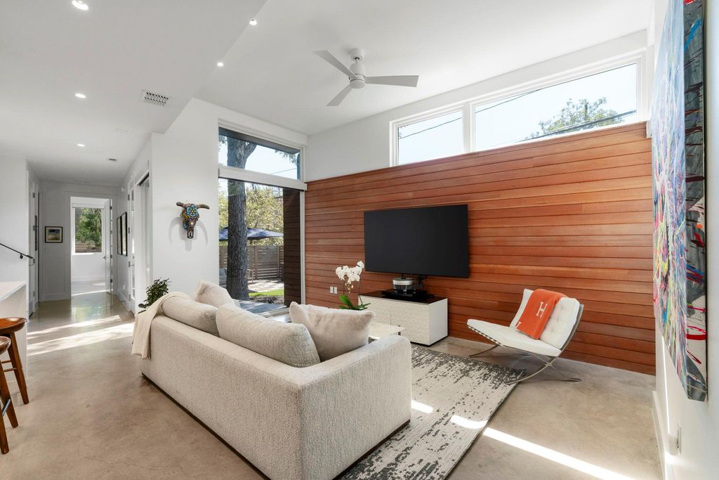Live the 78704 lifestyle in comfort and style. Situated on a corner lot near South First Street, this modern residence blends convenient, lock-and-leave ease with thoughtful, design-forward upgrades. Tall ceilings and concrete floors ground the main level, while white oak flooring continues upstairs for a warm, cohesive look. The kitchen shines with stainless Bertazzoni appliances, a gorgeous tile backsplash, and an over-sized breakfast island. A $70K Lutron HomeWorks system with Ketra lighting and automated shades elevates every room with tailored light and effortless control. The main-level primary suite features two walk-in closets and a serene, spa-style walk-in shower, and dual raised vanities. Upstairs, a flexible second living room/den/office accompanies two additional bedrooms and a full bath, creating the ideal separation of spaces. Custom cabinetry in the mudroom and hallway keeps daily life streamlined, and the garage was enclosed to create additional protected parking with an EV charging port. Outdoors, the fenced yard is fully turfed, fully irrigated, and designed for gatherings with an extended 475 SF patio and deck beneath a leafy canopy, plus room for a pool, if desired. Recent exterior washing, retaped roof, and refreshed soffits reflect conscientious care. A side wood shed organizes garden and lawn tools. This is comfortable, convenient luxury in the heart of 78704, minutes to coffee, dining, and South Austin's best parks and boutiques.