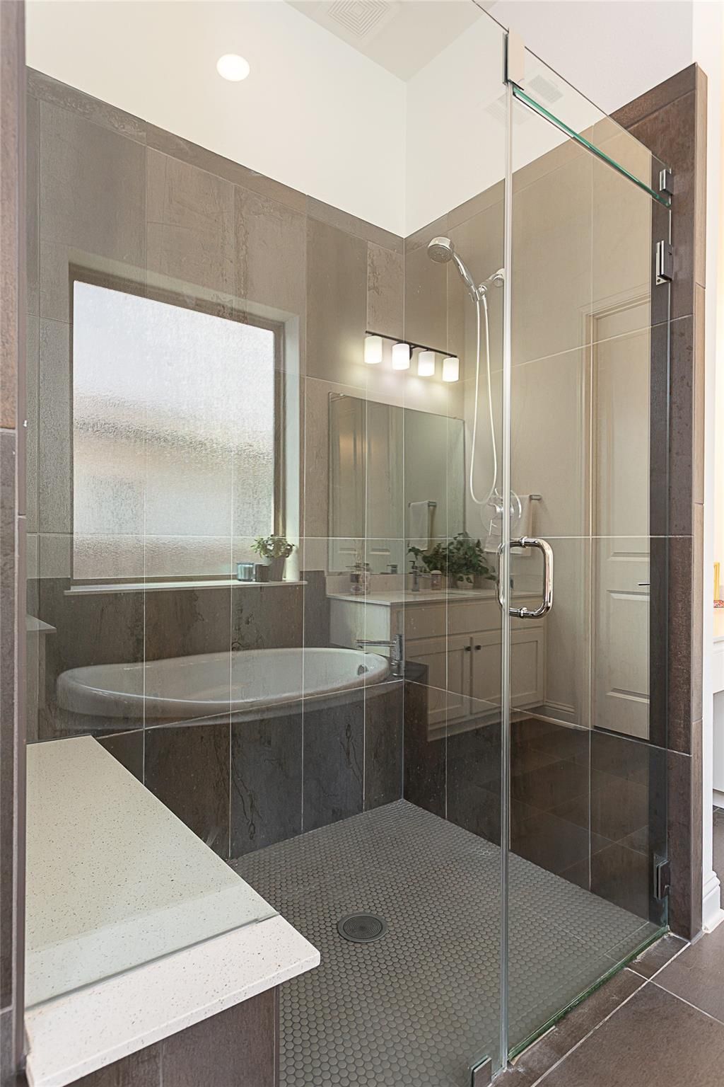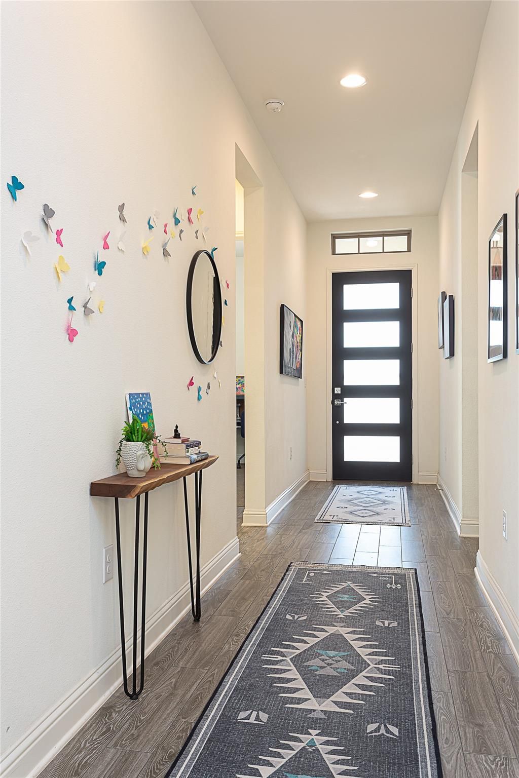Nestled in Greyrock Ridge, one of the newer sections of Circle C Ranch, this stunning single-story home backs to tranquil green space, offering rare privacy and peaceful, tree-filled views with no neighbors behind. Flooded with warm natural light, the home showcases a spacious, open-concept floor plan designed for both everyday comfort and effortless entertaining. Soaring ceilings and wood-like tile flooring set the tone throughout the main living areas, while the designer kitchen is the heart of the home. Featuring a large center island, dark-gray cabinetry, Silestone countertops, built-in oven, five-burner cooktop, and sleek black matte fixtures and hardware, this space blends modern sophistication with timeless style. The inviting family room is highlighted by coffered ceilings and dual sliding glass doors that open to a covered back patio overlooking lush greenery, perfect for morning coffee, evening gatherings, or simply unwinding in nature. The expansive primary suite offers a serene retreat with bay window and spa-inspired bath complete with a soaking tub, separate shower, three vanities, and a massive walk-in closet. Two additional secondary bedrooms provide comfort and flexibility, while the oversized laundry room doubles as a bonus flex space ideal for a home office or work out area. Outside, the home boasts beautiful curb appeal with lush native landscaping. Circle C Ranch is one of South Austin's premier communities where residents enjoy access to highly acclaimed schools, four community pools (including one with a slide), playgrounds, a clubhouse, soccer and activity center, disc golf course, and miles of scenic hiking trails. Greyrock also features its own dedicated pool and playground, direct access to the Violet Crown Trail and is just minutes from the Grey Rock Golf Course and Tennis Club. Conveniently to H-E-B, restaurants, shopping and the Alamo Drafthouse with its iconic rotating mural, this home perfectly blends lifestyle, and location.